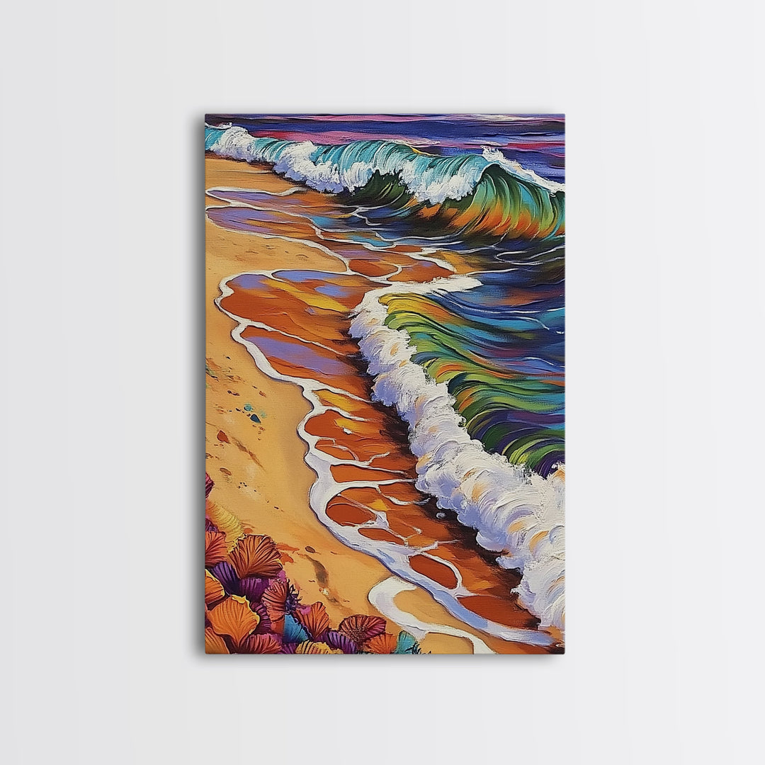 Beach Waves, Sunset, Framed Canvas Print, Vibrant Coastal Wall Art, Tropical Ocean Decor, Colorful Living Room Wall Art, Boho Beach Print