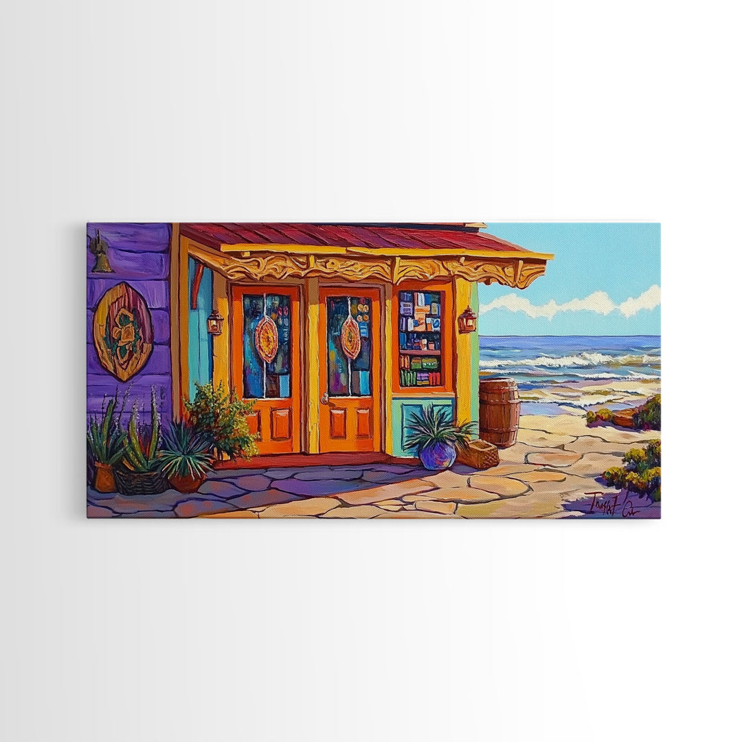Beachfront Bookstore, Coastal Colorful Shop, Seaside Cottage Art, Framed Canvas Print, Nautical Kitchen Wall Decor, Ocean Vibes Art