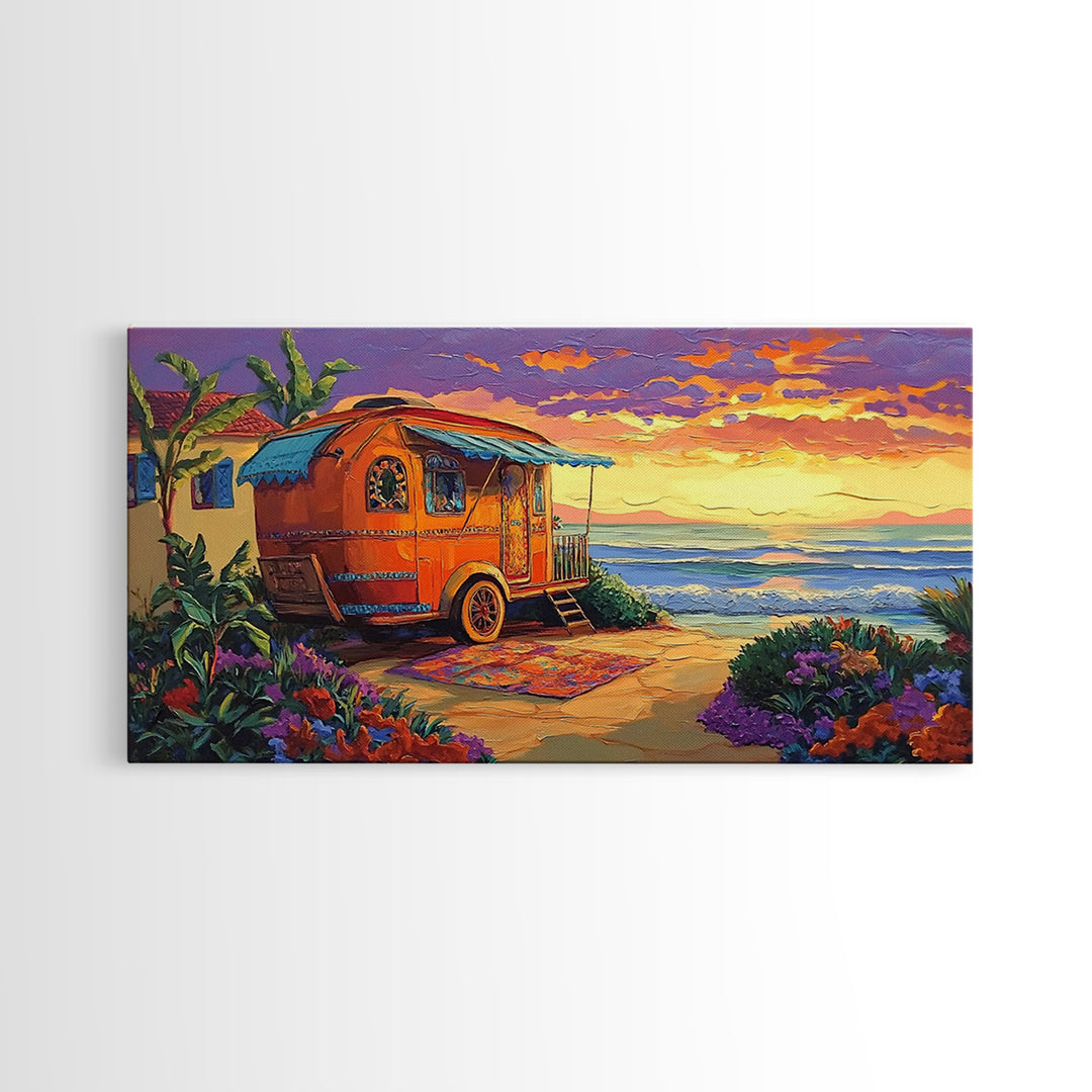 Beachfront Caravan, boho art, vintage travel painting, coastal decor, framed canvas print, whimsical art, above bed wall art, beach house