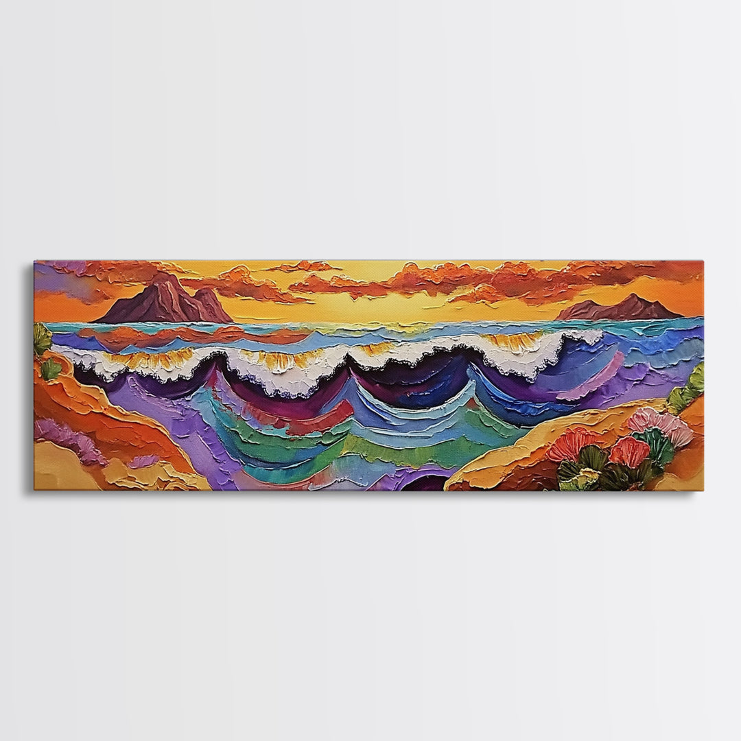Abstract Coastal Waves, Tropical Ocean Art, Bold Beach Scene, Colorful Bathroom Decor, Boho Chic Framed Canvas Print, Bedroom Wall Decor