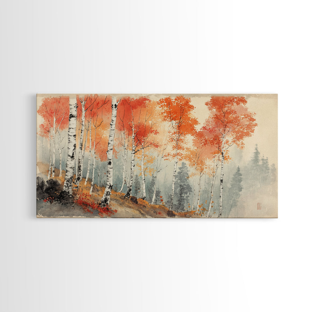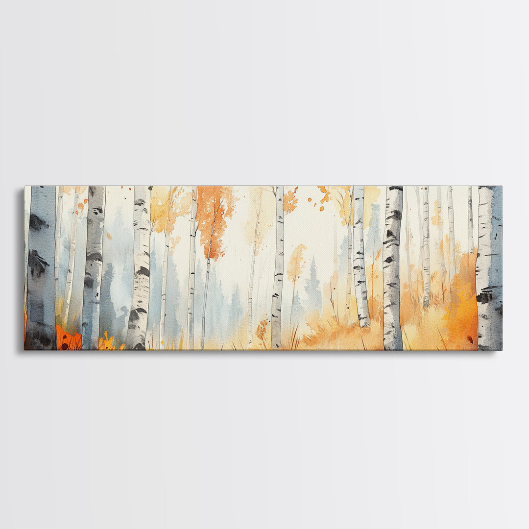 Birch tree painting, autumn decor, extra wide art, botanical prints, nature wall art, framed canvas print, long narrow wall art, wabi sabi art