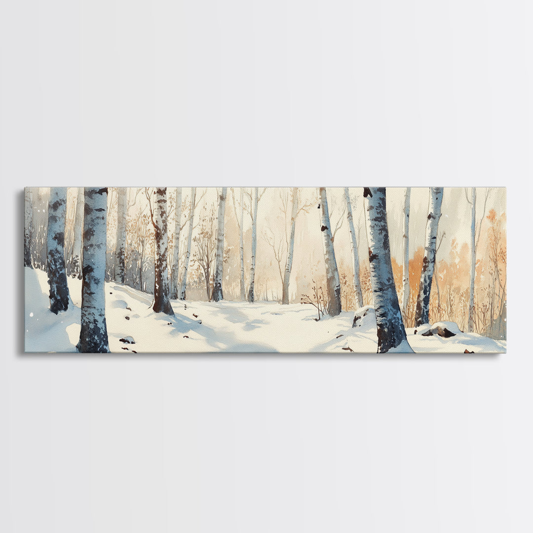 Birch Tree Forest In The Snow Covered Winter Framed Canvas Print, Panoramic Wall Art, Original Birch Tree Art, Birch Tree Painting, Horizontal Art