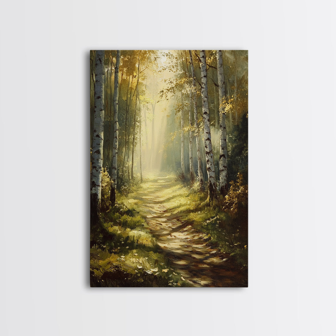 Birch Forest Path Framed Canvas Print Rustic Wall Art Farmhouse Wall Art Nature Landscape Art Above Bed Wall Art Fall Decor Living Room Art