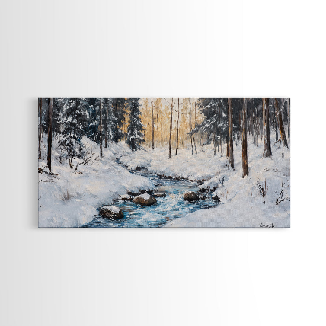 Birch Tree Painting, Snowy River Art, Winter Landscape, Framed Canvas Print, Farmhouse Art, Wabi Sabi Art, Tall Narrow Art