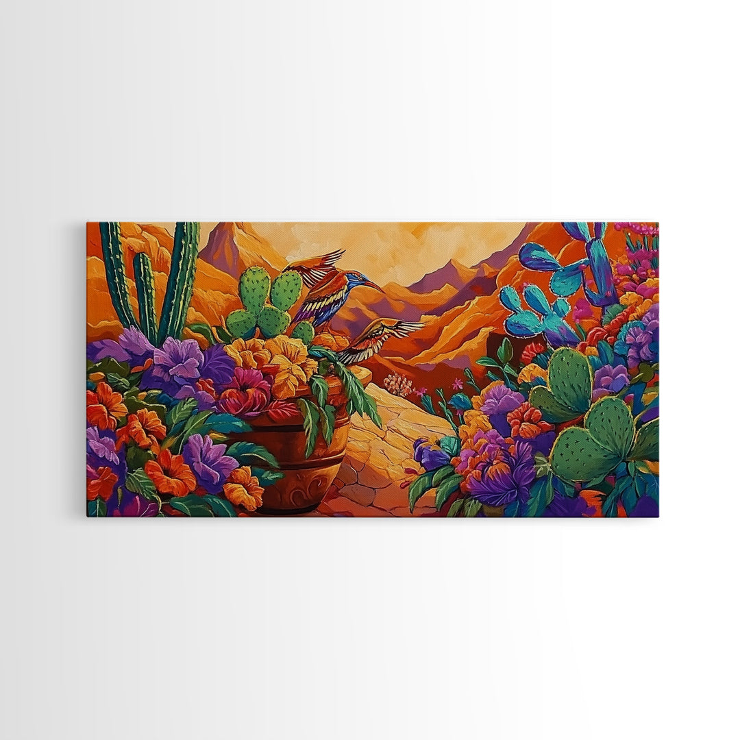 Birds Cactus, Blossoms, Bright Nature Framed Canvas Print, Desert Floral Wall Decor, Southwest Living Room Boho Wall Art