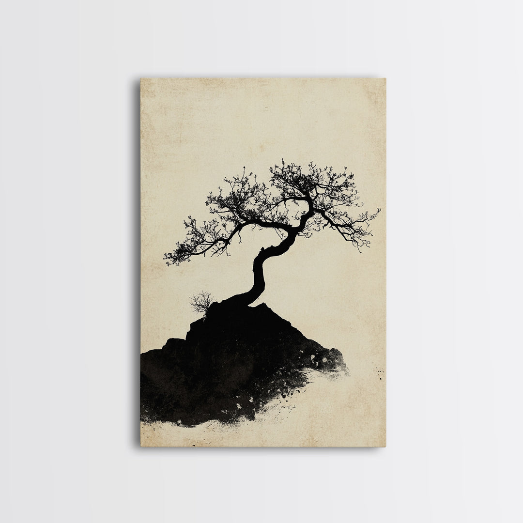 Black and White Bonzai Tree Framed Canvas Print, Wabi Sabi Japanese Style Home Decor, Minimalist Art, Moody Decor, Moody Art