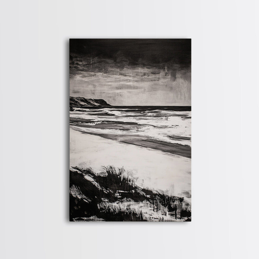 Black and White Beach, Moody Sky, Stormy Waves, Framed Canvas Print, Minimalist Wall Art, Modern Home Decor, Nautical Landscape
