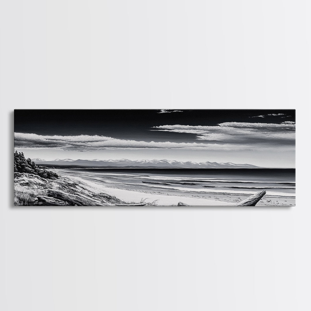 Black and White Beach, Monochrome Seascape, Moody Sky, Nature Photography, Framed Canvas Print, Minimalist Wall Art, Elegant Home Decor