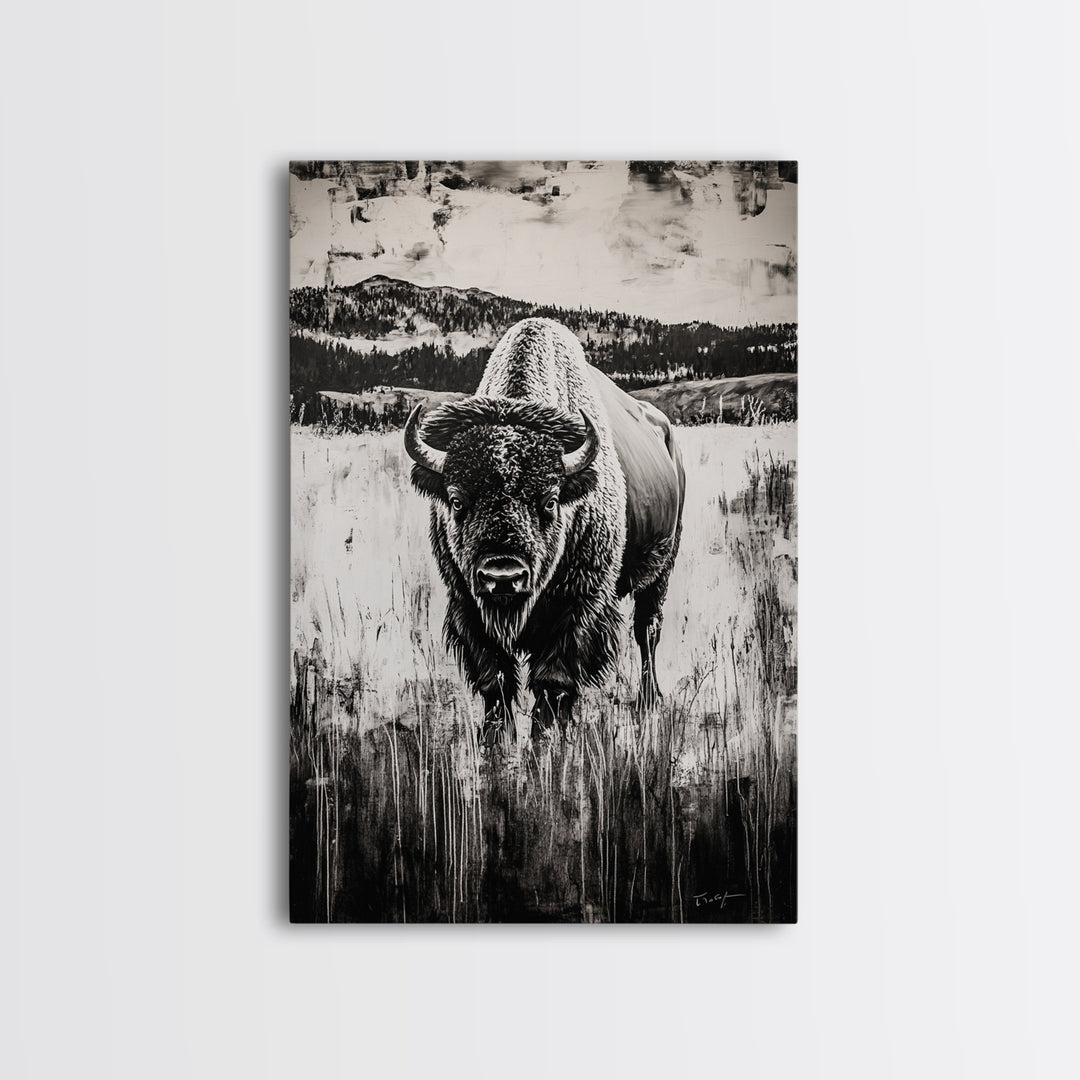 Black and White Buffalo, western wall art, rustic decor, extra wide art, moody art, minimalist painting, framed canvas print, farmhouse art