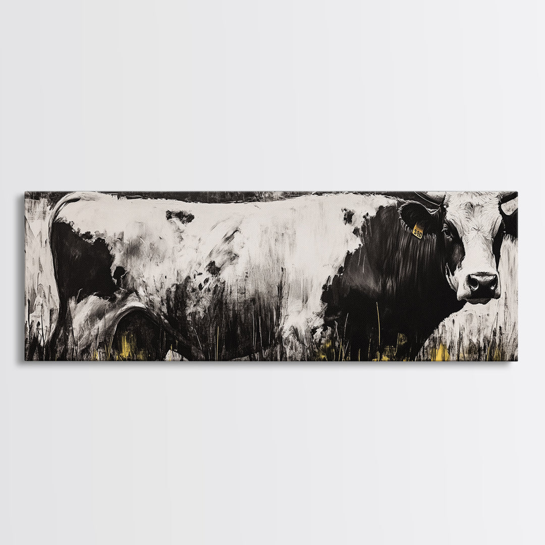 Black and White Cow, farmhouse art, rustic wall art, extra wide art, wabi sabi art, vintage horse art, Canvas Print