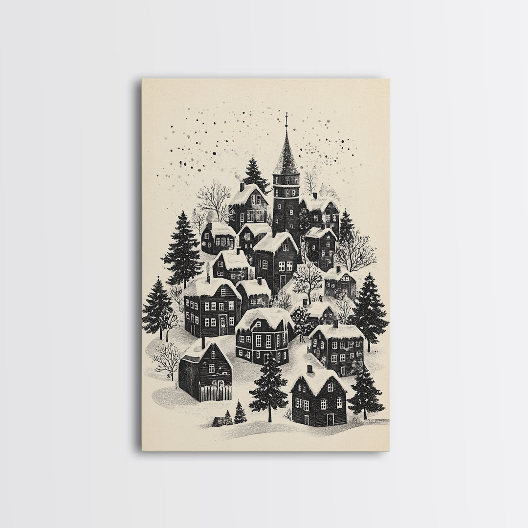 Black and White Sketch of A Christmas Village Canvas Print - Framed Canvas - Minimalist Christmas Art - Boho Christmas Art - Rustic Christmas Art