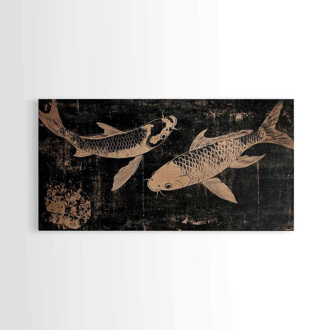 Black and White Koi Fish Oil Painting Print, Elegant Japanese Style Wood Block Print Artwork, Canvas Print Ready To Hang, Centerpiece Art