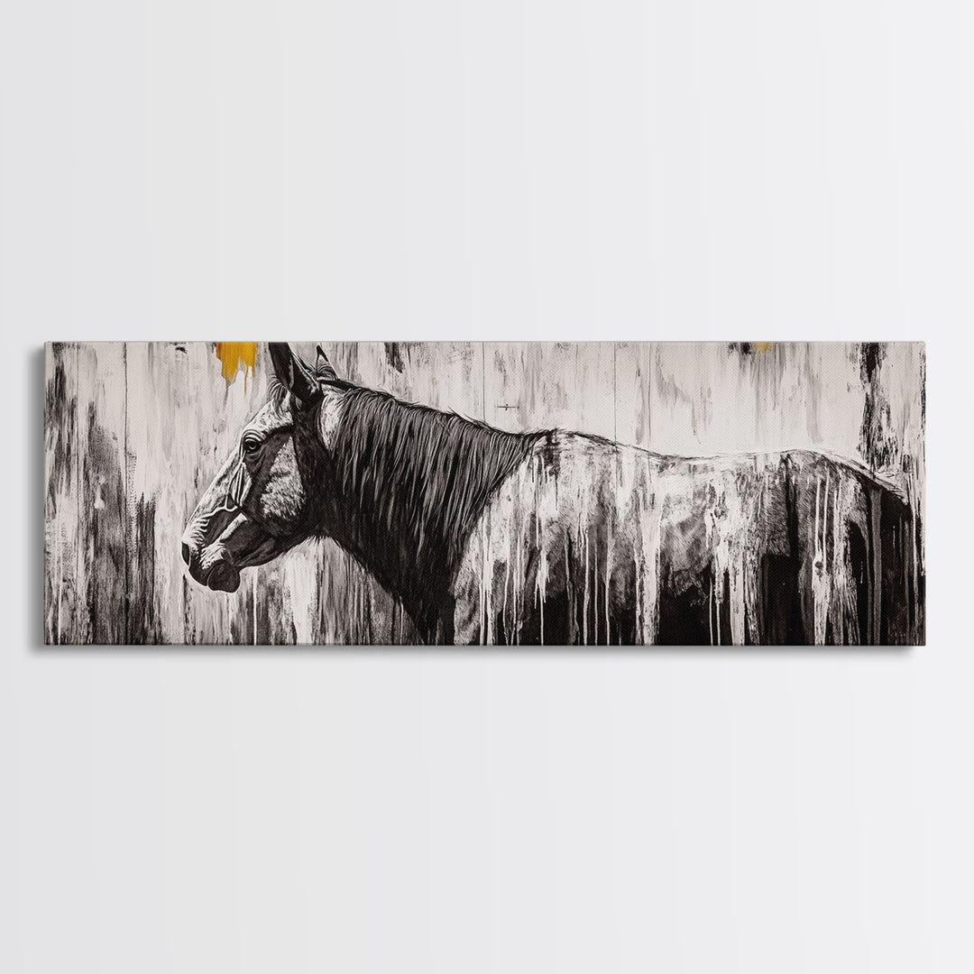Black and white horse, vintage horse art, wabi sabi art, extra wide art, moody art, framed canvas print, farmhouse art, rustic decor