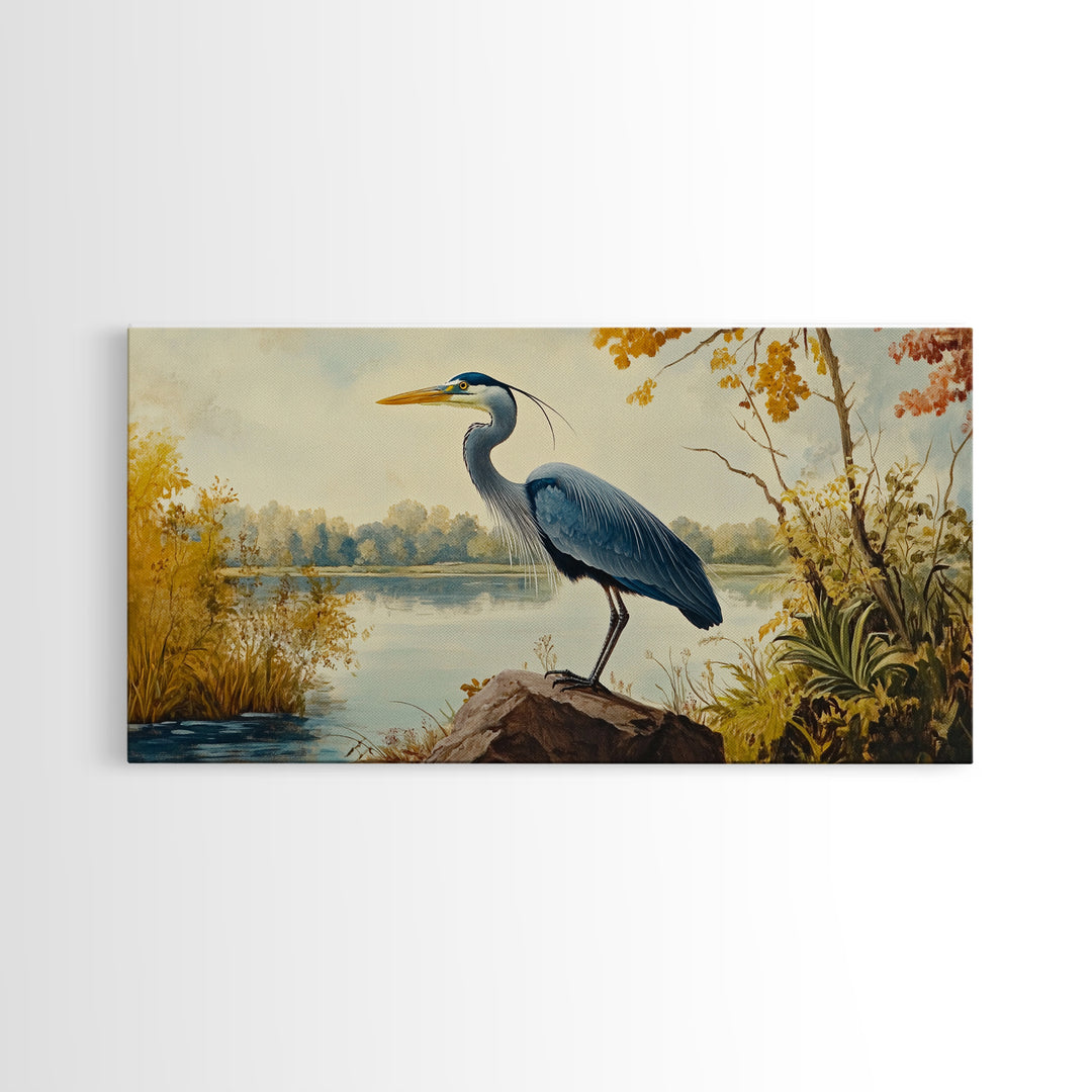 Blue Heron Wall Art, Framed Canvas Print, Nautical Home Decor, Blue Heron Painting, Panoramic Horizontal Wall Art