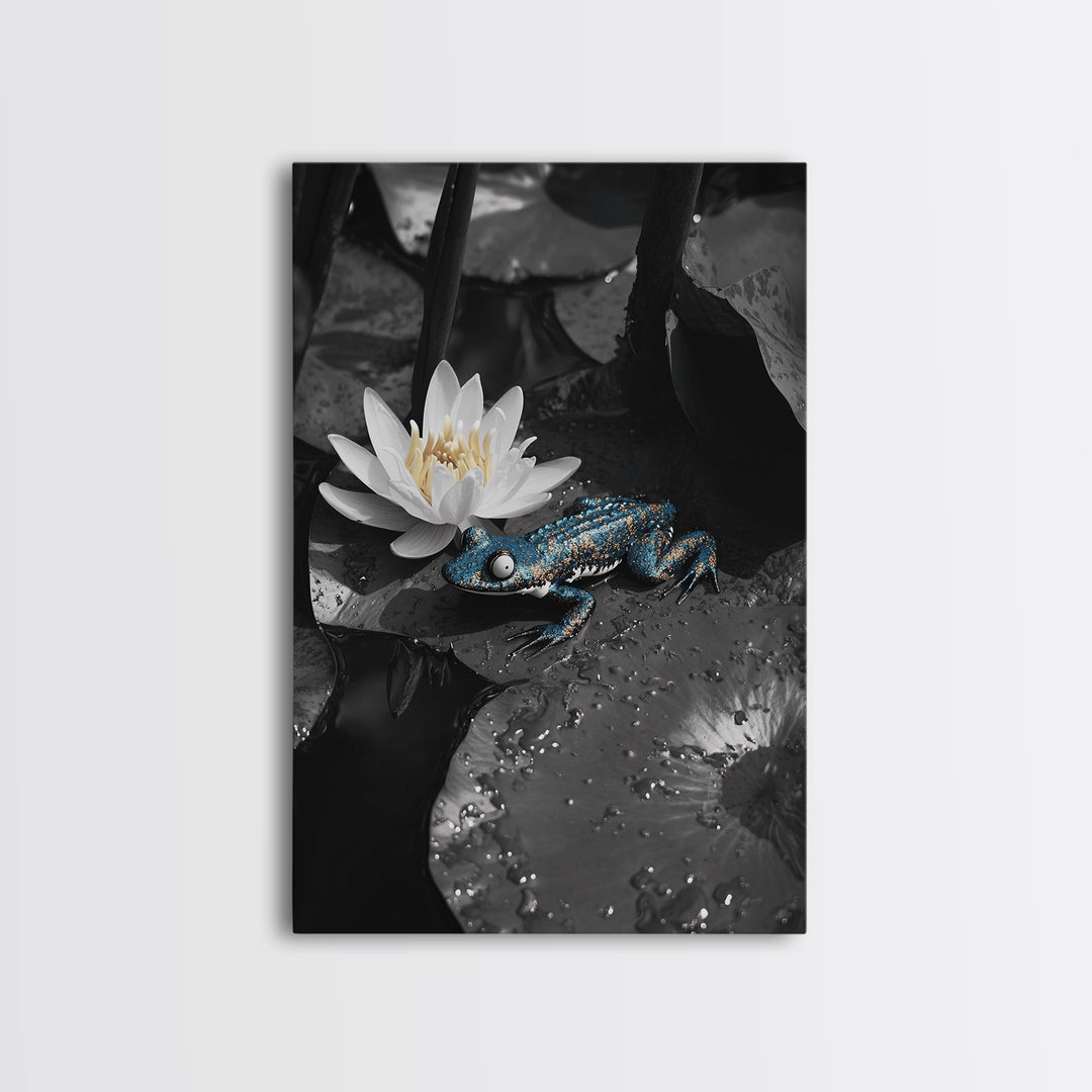 Blue Frog, Water Lily, Pond Art, Nature Canvas Print, Whimsical Animal Wall Decor, Bathroom Wall Art, Modern Cottagecore Art
