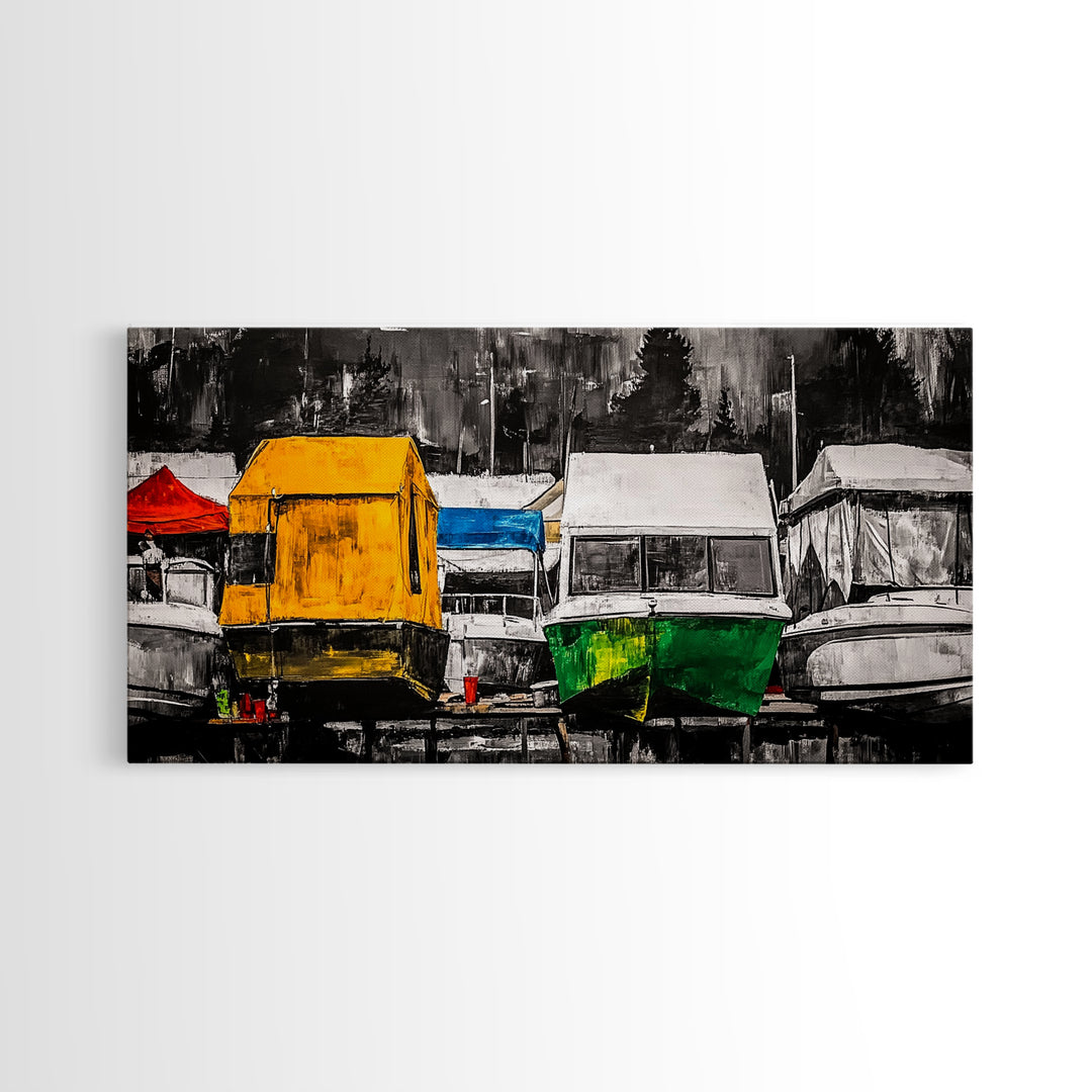 Boats at Dock, nautical painting, coastal wall art, rustic art, extra wide art, panoramic painting, above sofa art, Canvas Print