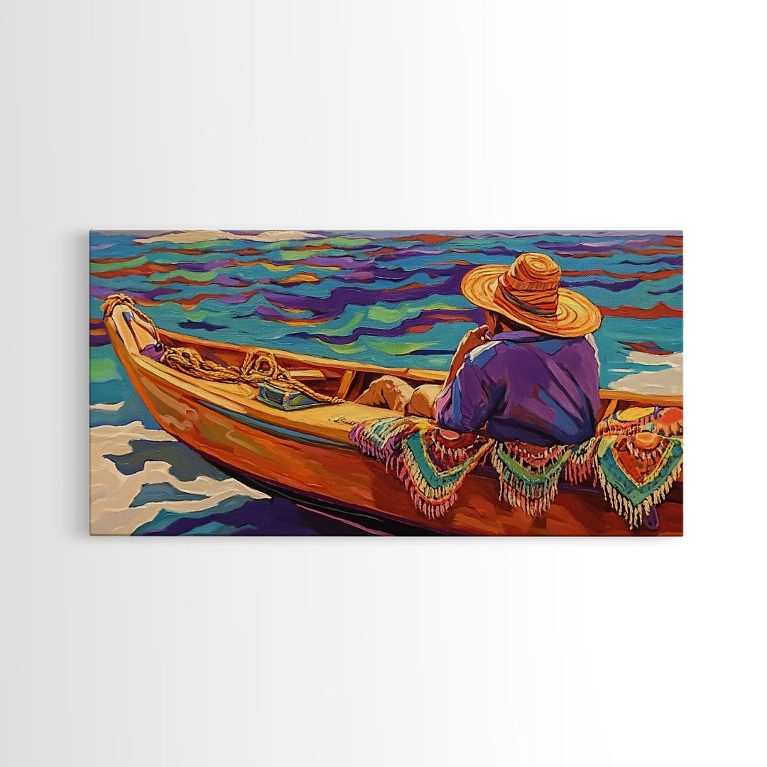 Boat Fisherman, Serene, Waters, Canvas Print colorful coastal life art Office Wall Art tropical ocean boho decor relaxed living