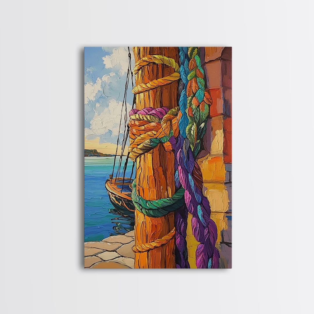 Boat Dock, Ropes, Framed Canvas Print, Nautical Coastal Wall Art, Vibrant Marina Scene, Boho Seaside Decor, Bathroom art, Office Wall Art