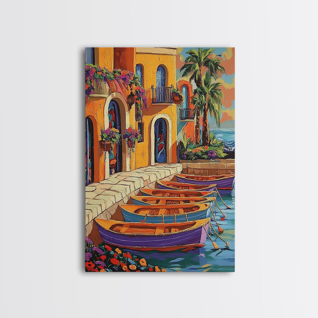 Boats Harbor, Mediterranean, Framed Canvas Print, Coastal Village Wall Art, Colorful Seaside Home Decor, Kitchen art, Bathroom Wall Art