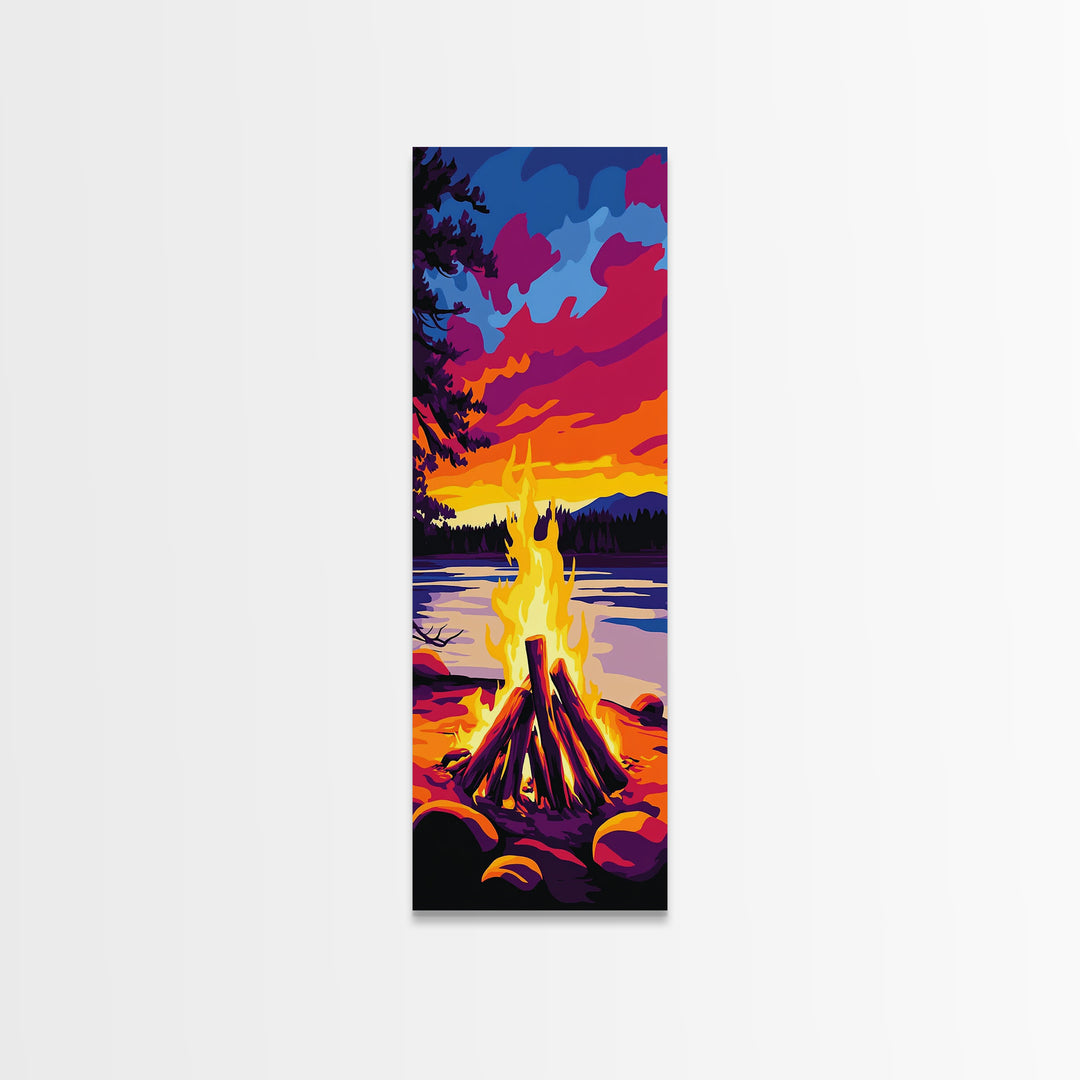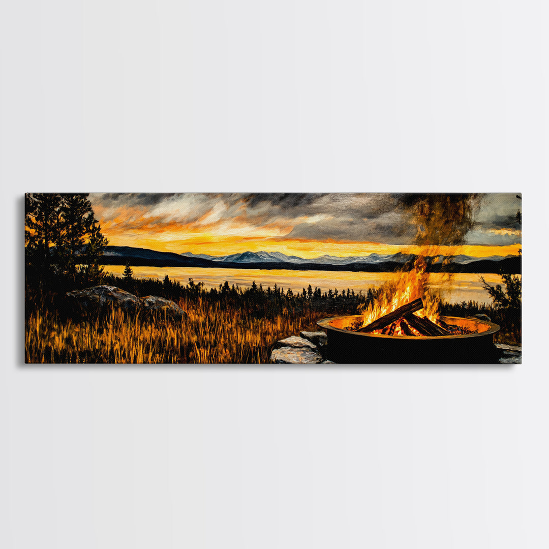 Bonfire, lakeside evening, autumn wall art, warm sunset painting, outdoor adventure art, extra wide art, framed canvas print