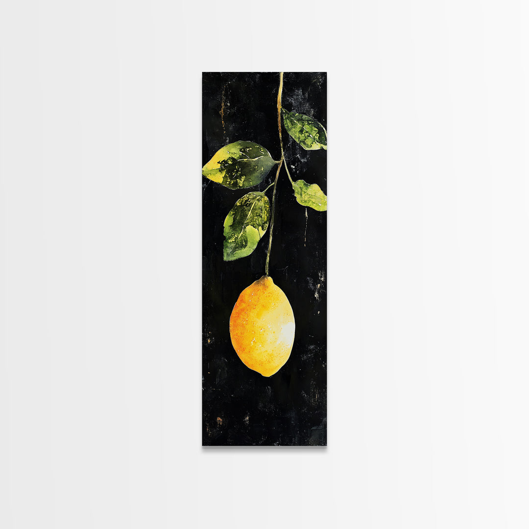 Botanical Lemon Painting on Black Canvas Print with Framed Option, Kitchen Art for Rustic Decor, Tall Skinny Art, Cottagecore Wall Art