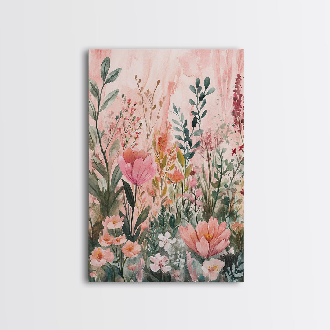Botanical Garden Framed Canvas Print Wildflower Painting Cottagecore Botanical Prints Feminine Bedroom Wall Art Gift Idea Pink Green Art