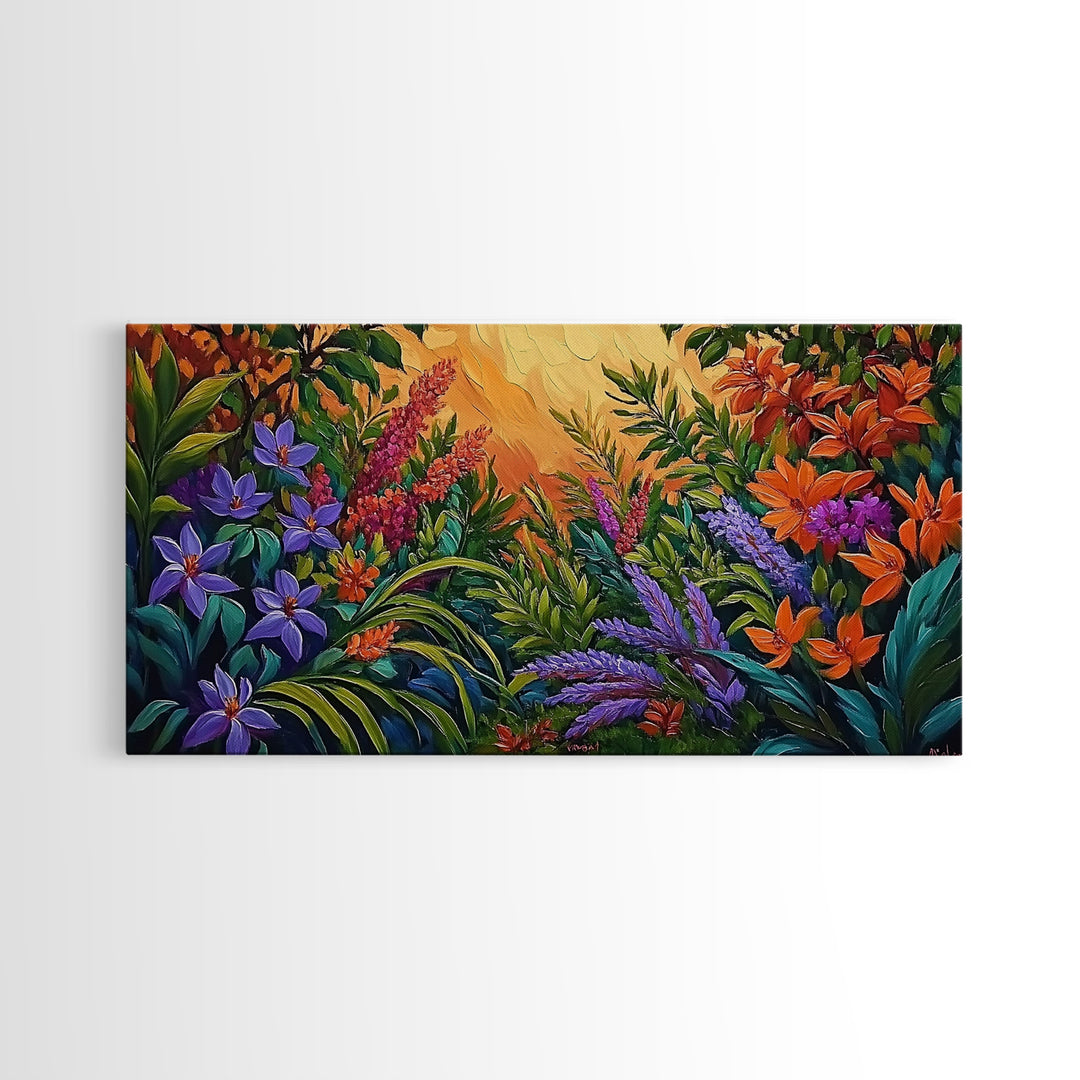 Botanical Jungle, Wildflowers, Painting, Framed Canvas Print vibrant floral bedroom art, colorful garden decor, kitchen wall art