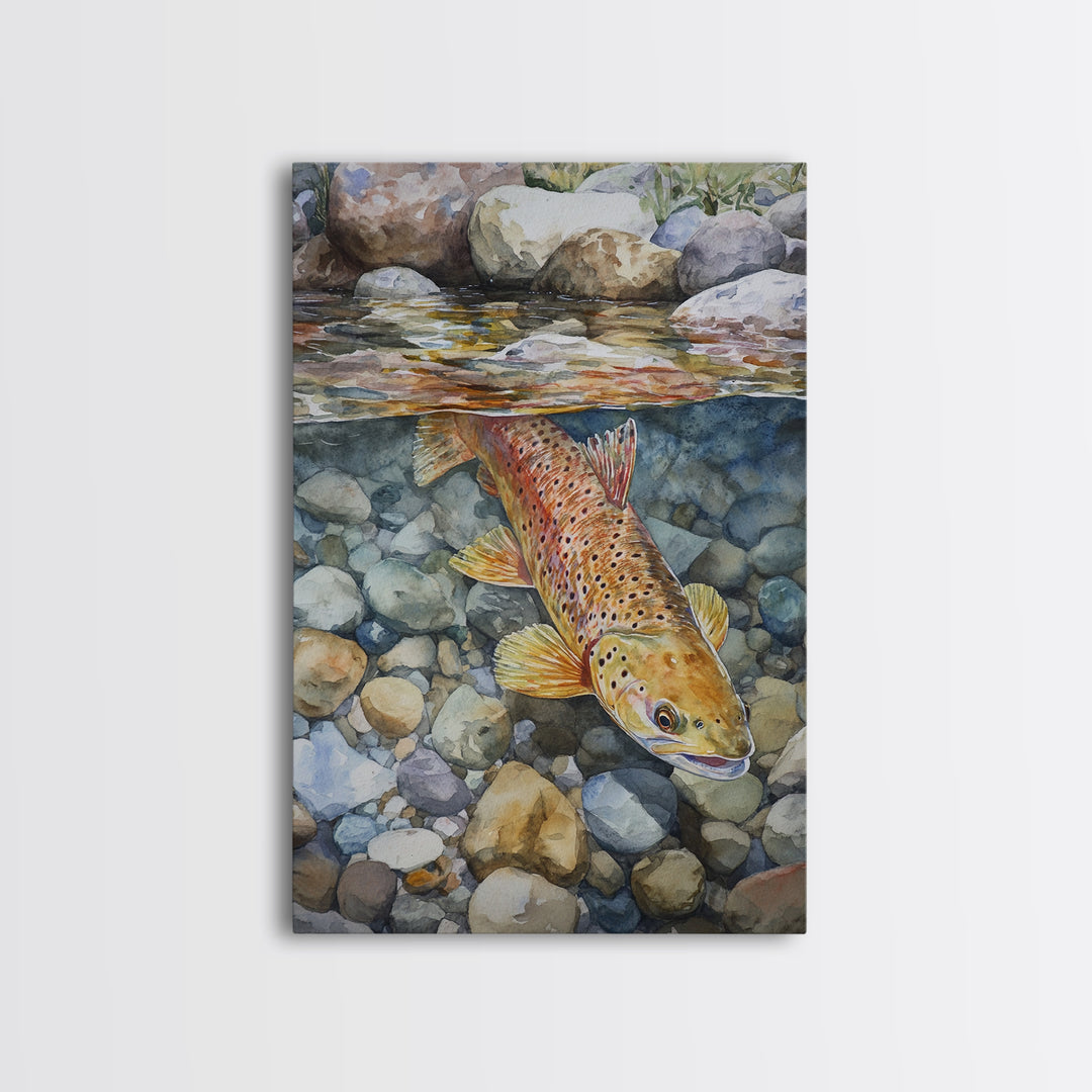 Brown Trout Closeup, Riverbed Focus, Dramatic Fish Art, Framed Canvas Print, Fisherman Gift, Cabin Wall Art, Rustic Outdoor Decor