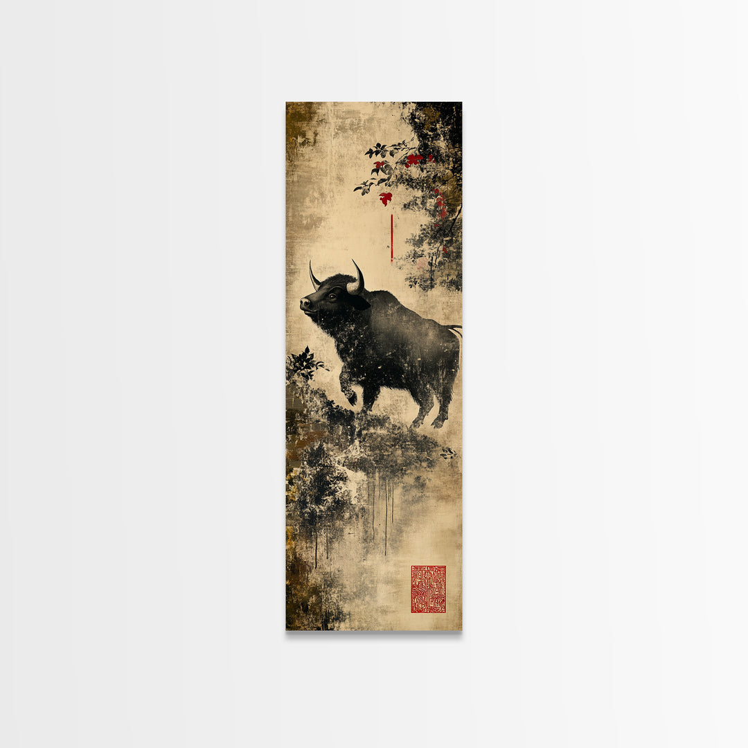 Bull Framed Canvas Print, Rustic Wall Art, Vintage Farmhouse Decor, Asian Inspired Artwork, Moody Living Room or Bedroom Decor Gift Idea