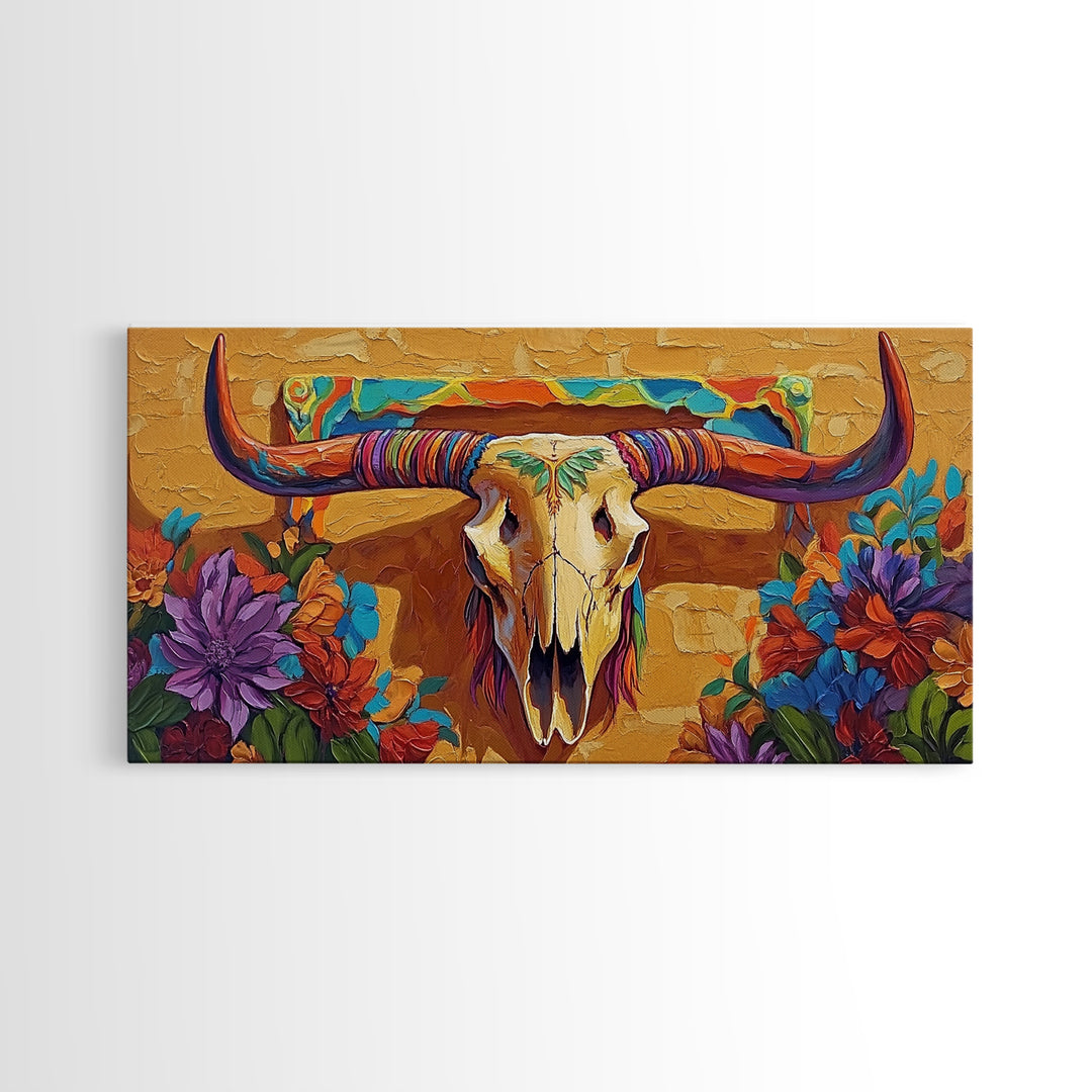 Bull Skull, Floral, Colorful, Framed Canvas Print, western boho wall decor, rustic desert style, entryway art, office wall art