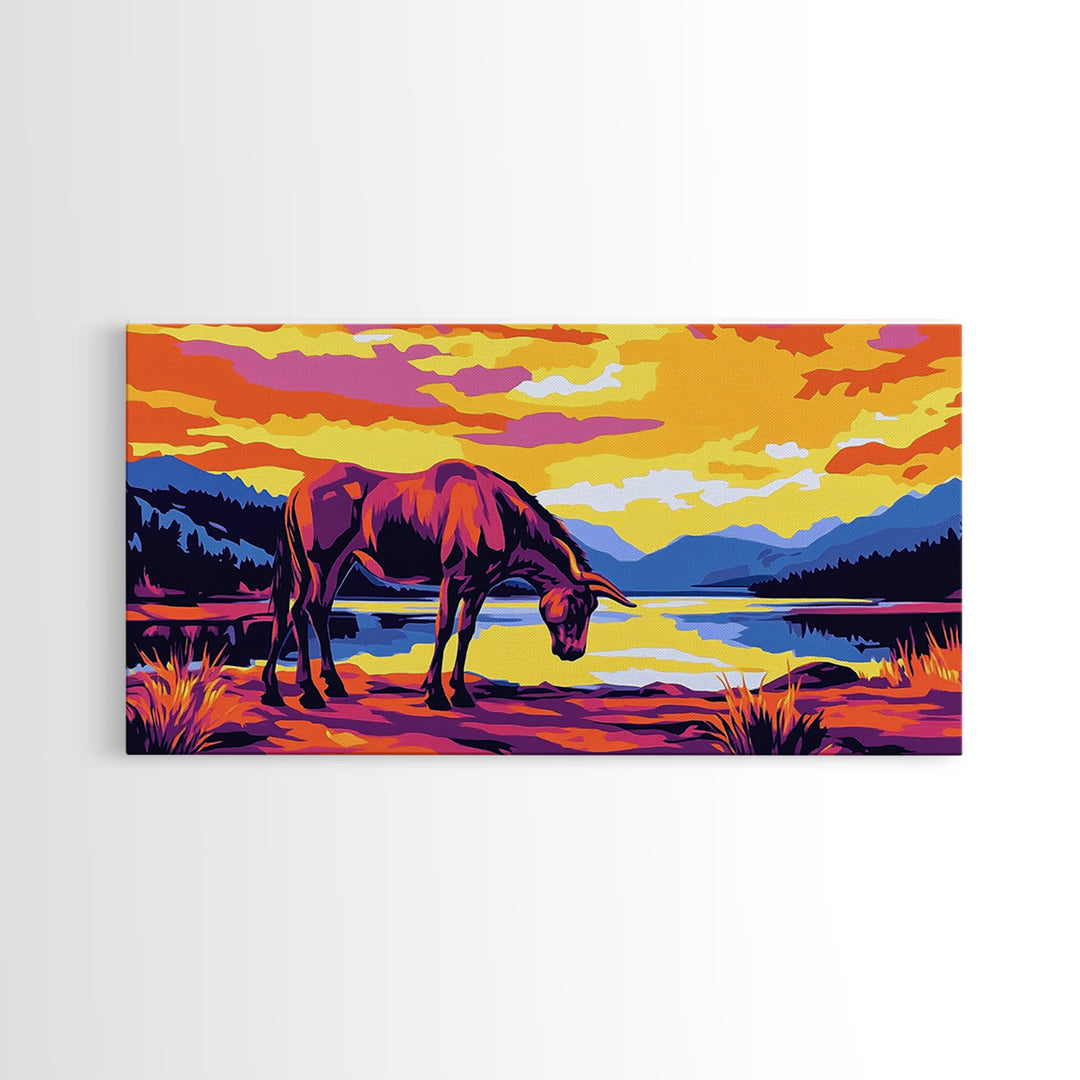 Buffalo, mountain, lake art, colorful western, rustic landscape, panoramic art, sunset wall art, farmhouse decor, canvas print