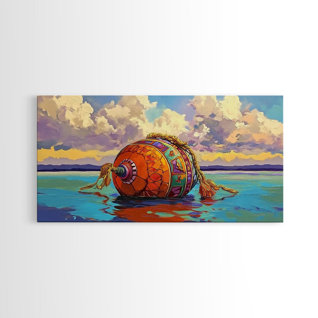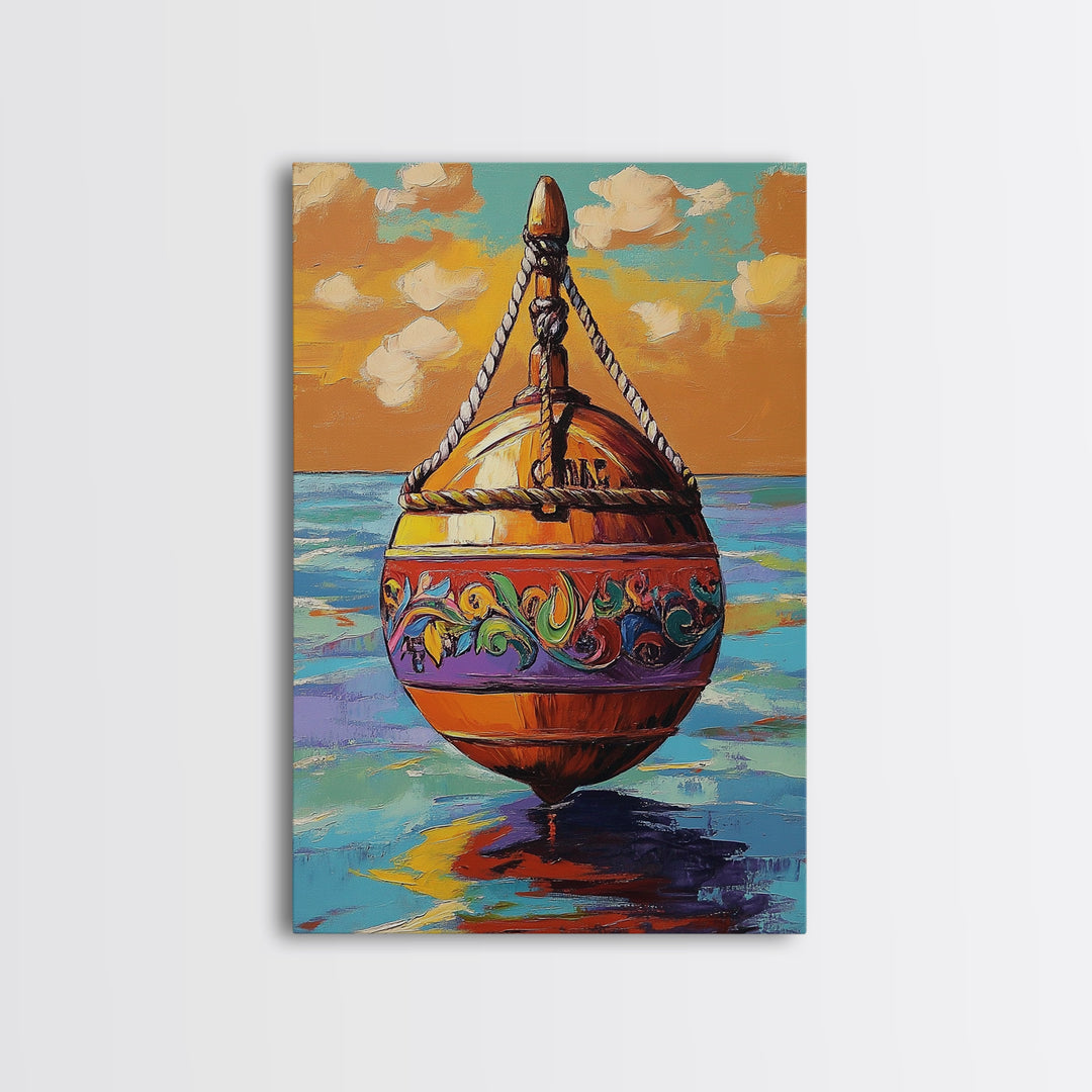 Buoy Nautical, Floating, Art, Framed Canvas Print beach house bathroom decor, colorful ocean wall art, boho coastal hallway artwork