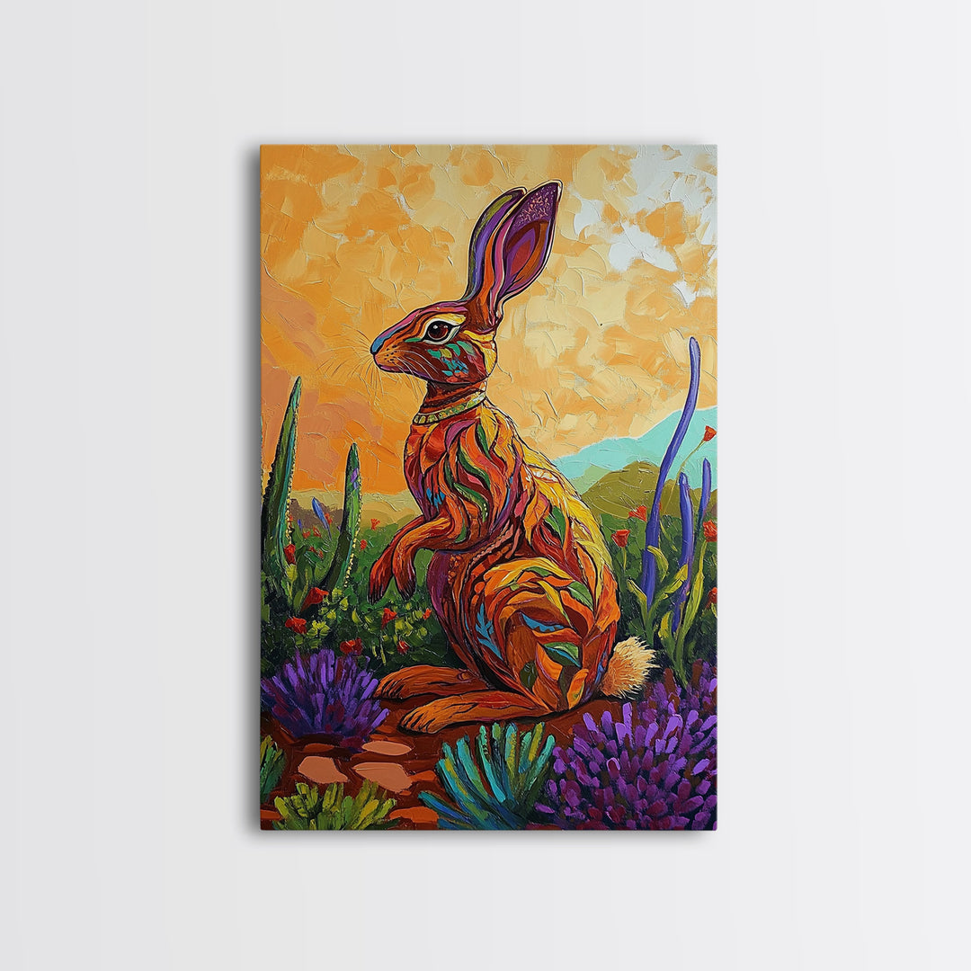 Bunny Cactus, Desert, Whimsical Framed Canvas Print, Eclectic Living Room Wall Art, Boho Southwest Decor, Colorful Animal Painting