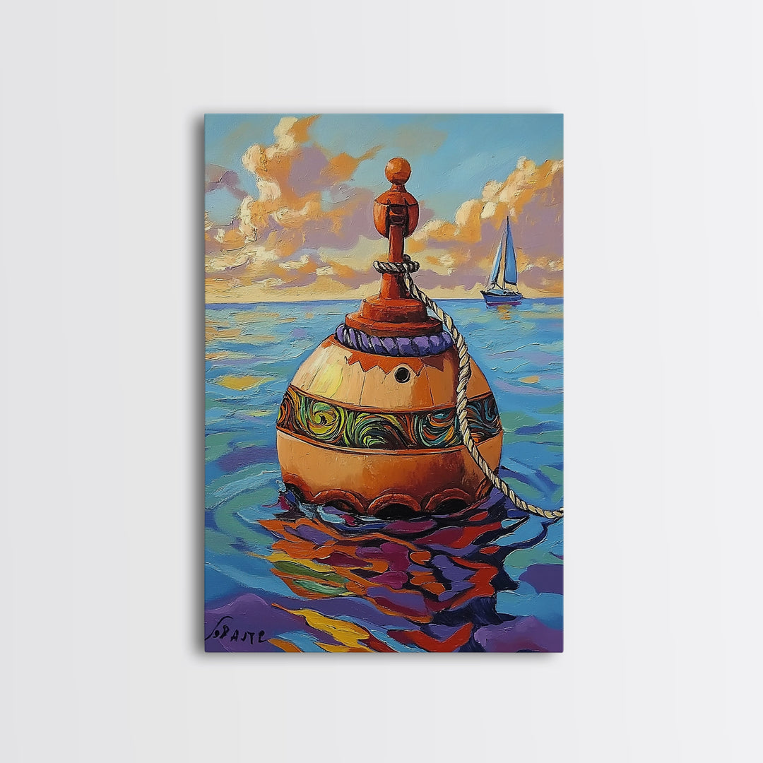 Buoy Ocean Sailboat Painting, Framed Canvas Print, Nautical boho decor, beach home wall art, coastal sunset colors, lakehouse vibe