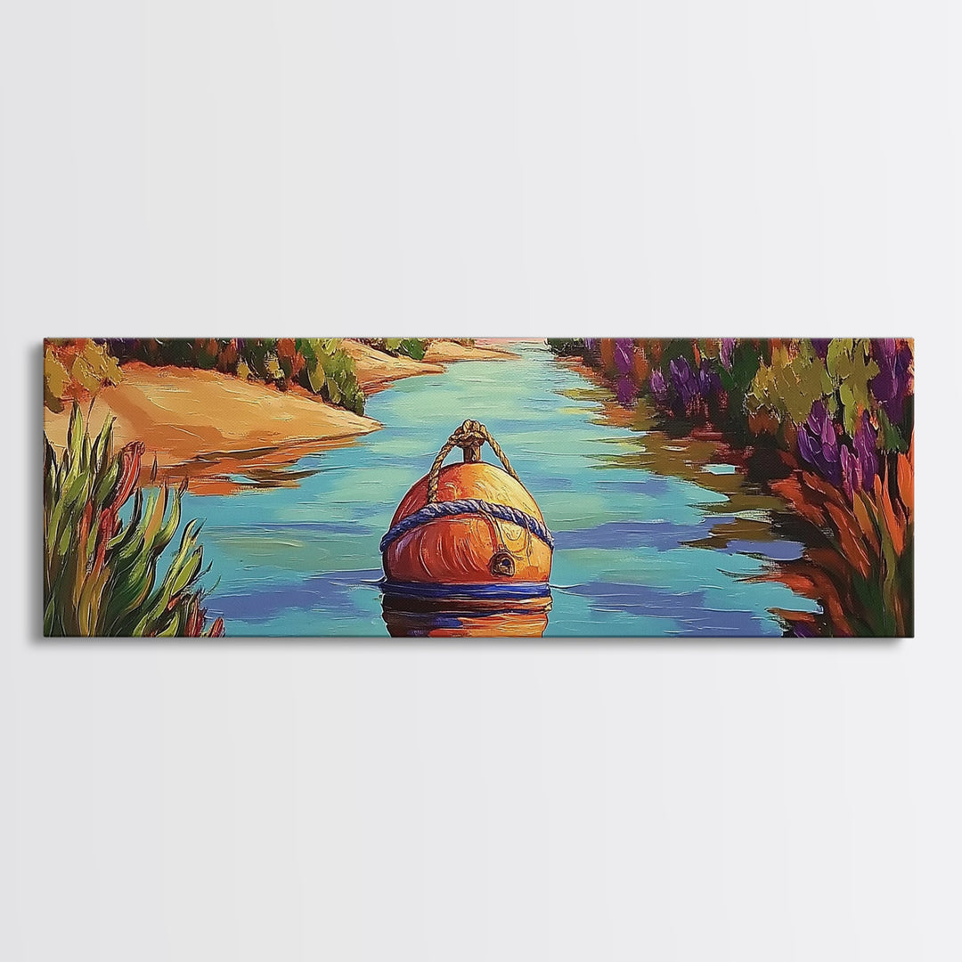 Buoy Painting, River Calm, Coastal Reflection, Peaceful Dock, Canvas Print, lake cabin art, nautical wall decor, colorful waterway scene