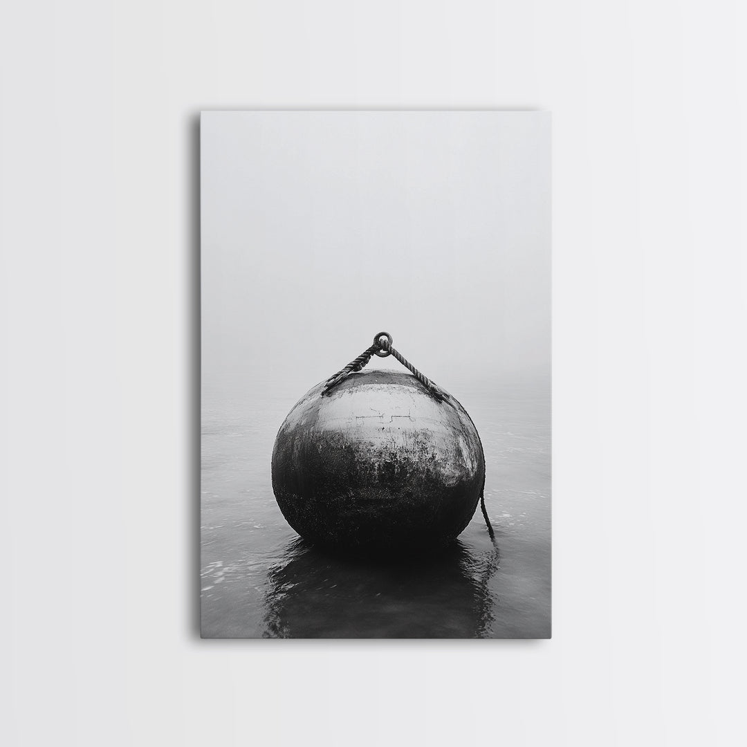 Buoy Stillness, Ocean Fog, Minimal Water, Framed Canvas Print, Nautical Wall Art, Bathroom Decor, Calm Coastal Black and White Art