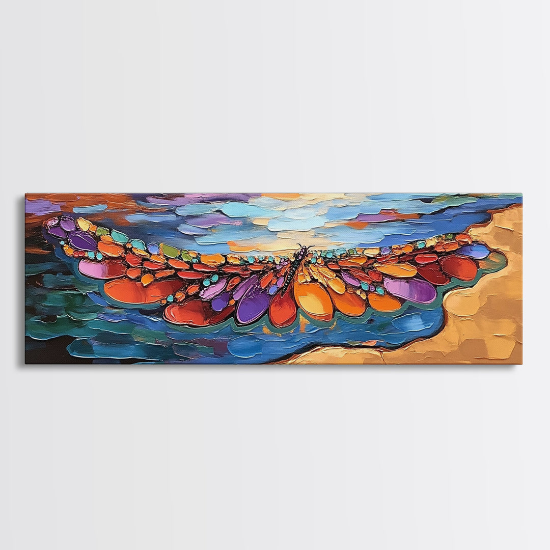 Butterfly On Shore, Ocean Sunset Art, Bohemian Style, Canvas Print, Colorful Wall Decor, Living Room Nature Painting