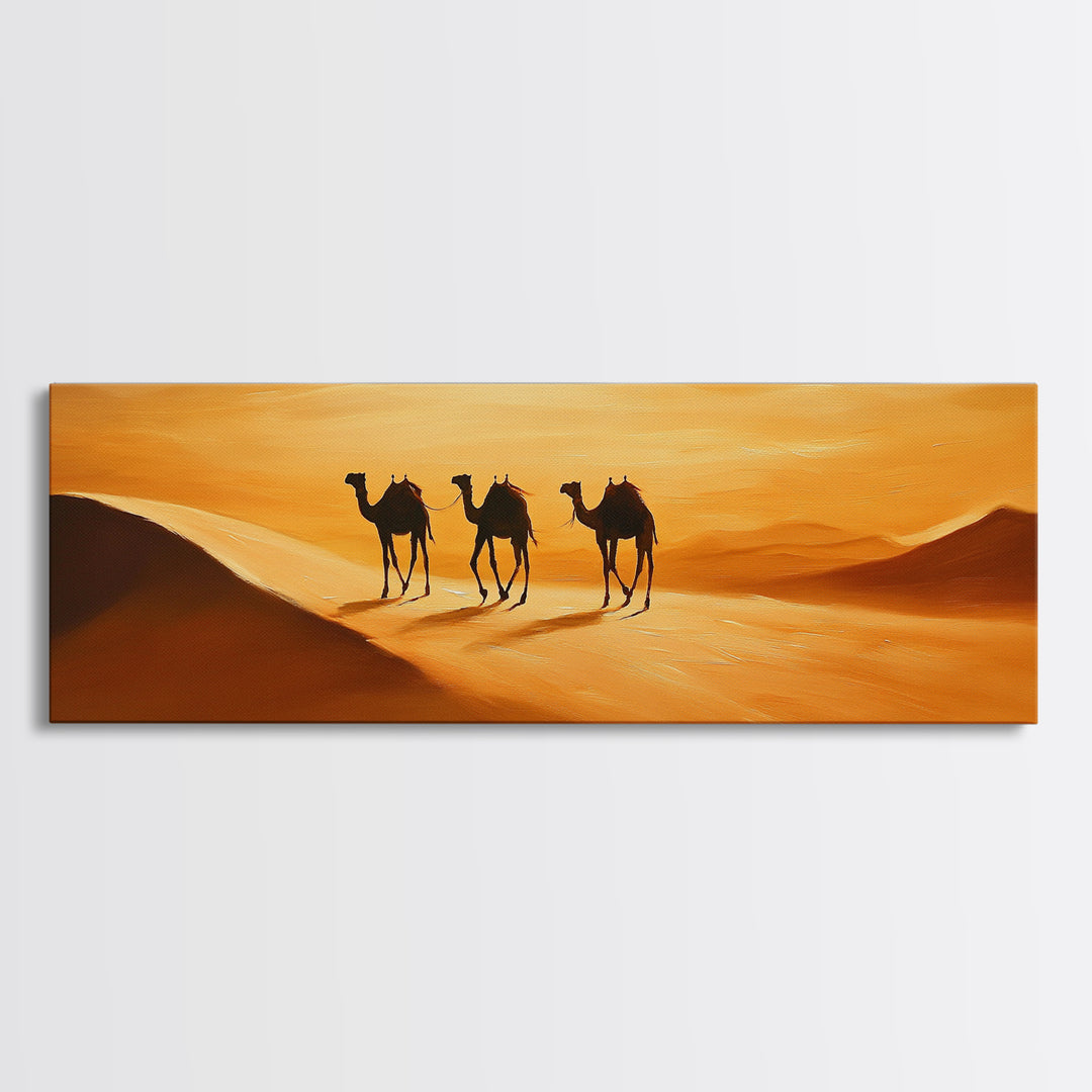 Camels in the desert Framed Canvas Print, Desert Painting, Desert Wall Art, Southwestern Decor, Minimalist Decor, Orange Hues Art