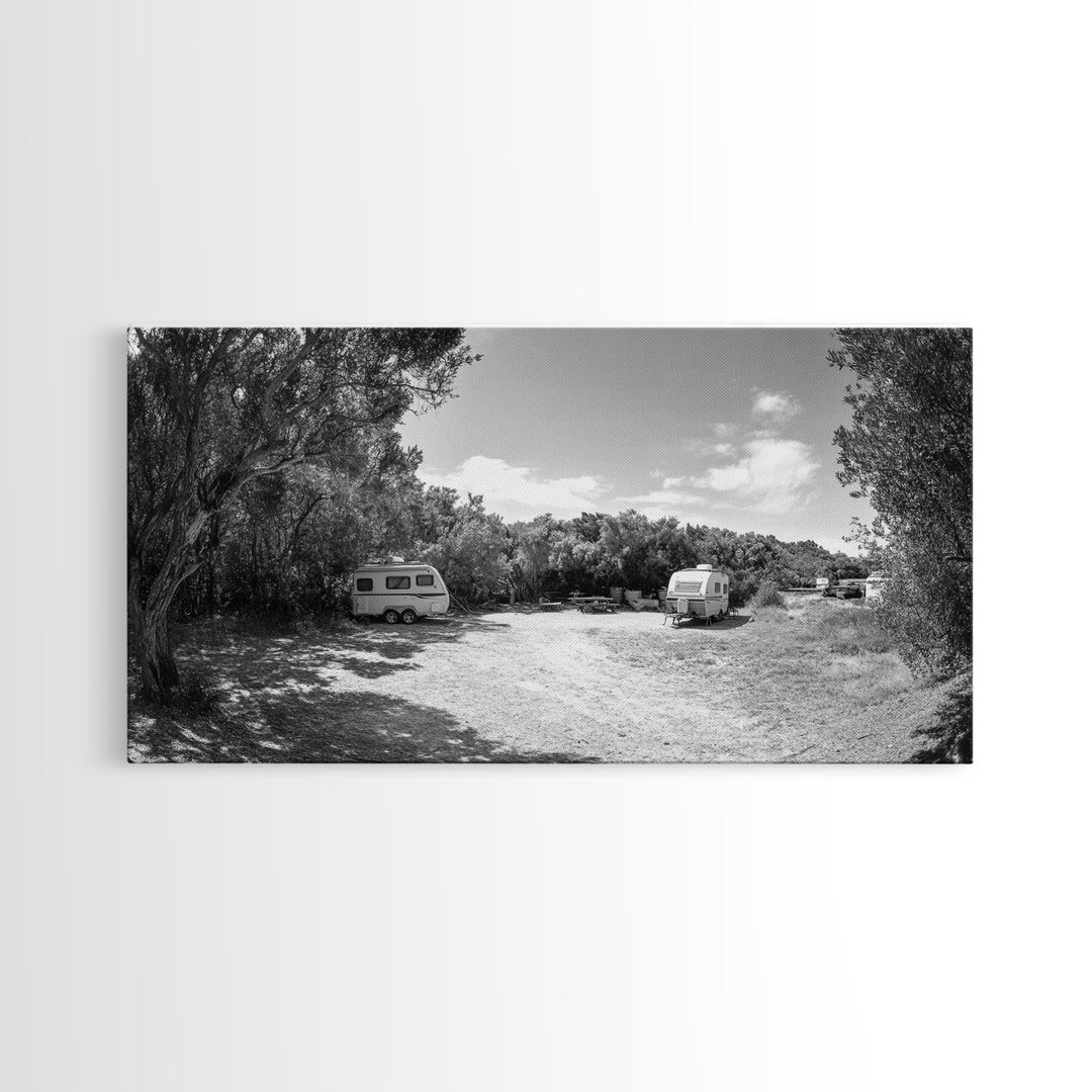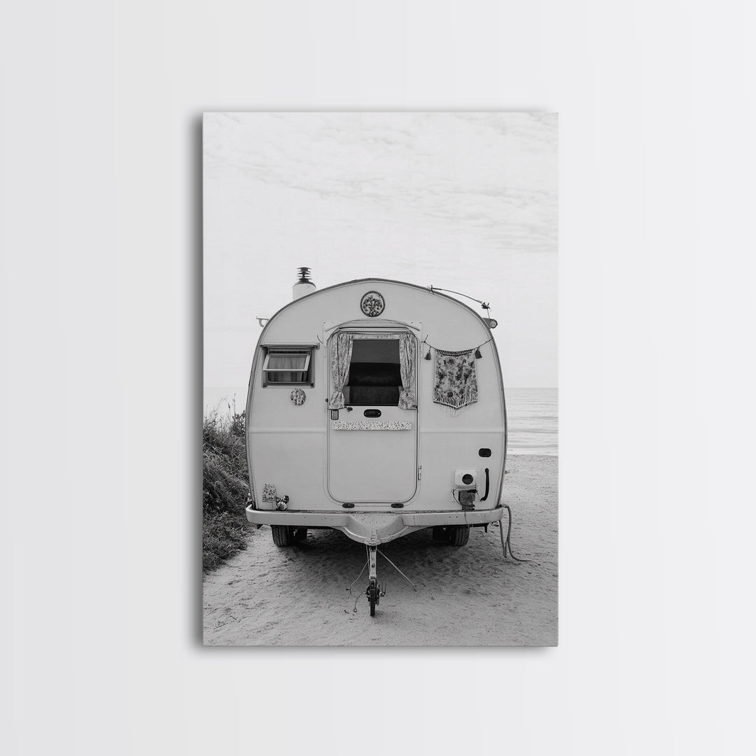 Camper, Vintage, Beach, Boho - Coastal trailer life, Framed Canvas Print, retro decor, great bedroom or travel-inspired office art, black white