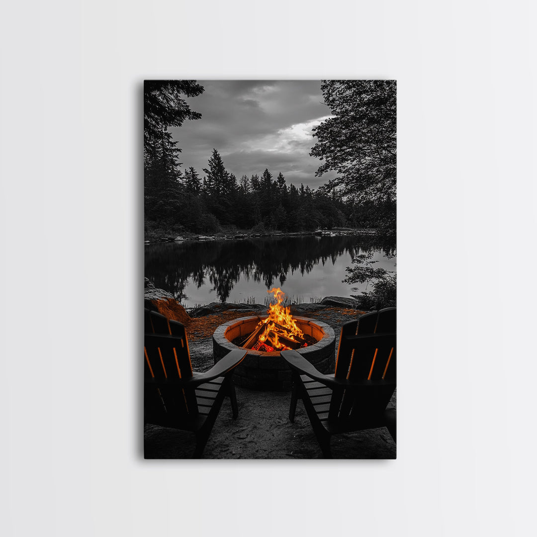 Campfire Chairs Lake, Autumn Firepit Scene, Rustic Retreat, Cabin Escape, Framed Canvas Print, cozy wall art, man cave cabin decor