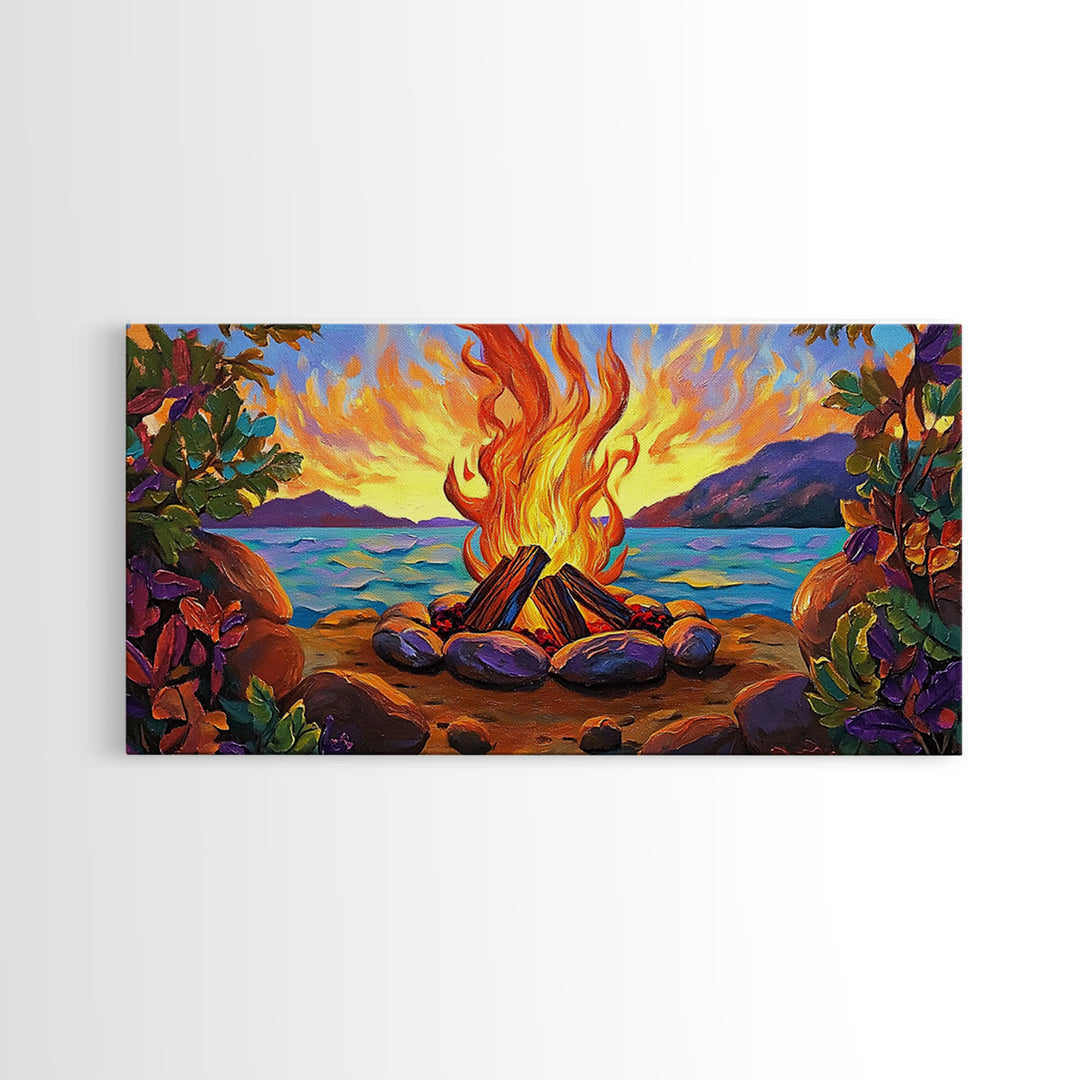 Campfire by Lake, bonfire painting, rustic wall art, mountain painting, framed canvas print, above sofa art, cozy night decor