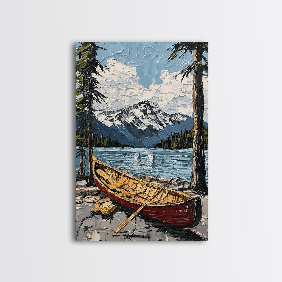 Canoe in the Mountains Framed Canvas Print, Abstract Pacific Northwest Oil Painting Print, Oregon or Washington Wall Art