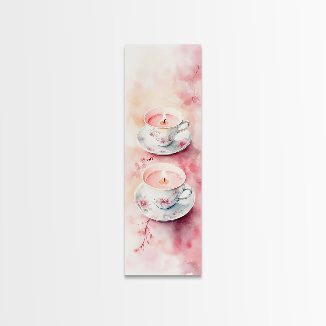 Candlelight Framed Canvas Print, Cozy Pastel Teacup Candles Art, Light Pink Wall Decor, Bedroom or Dining Room Whimsical Artwork