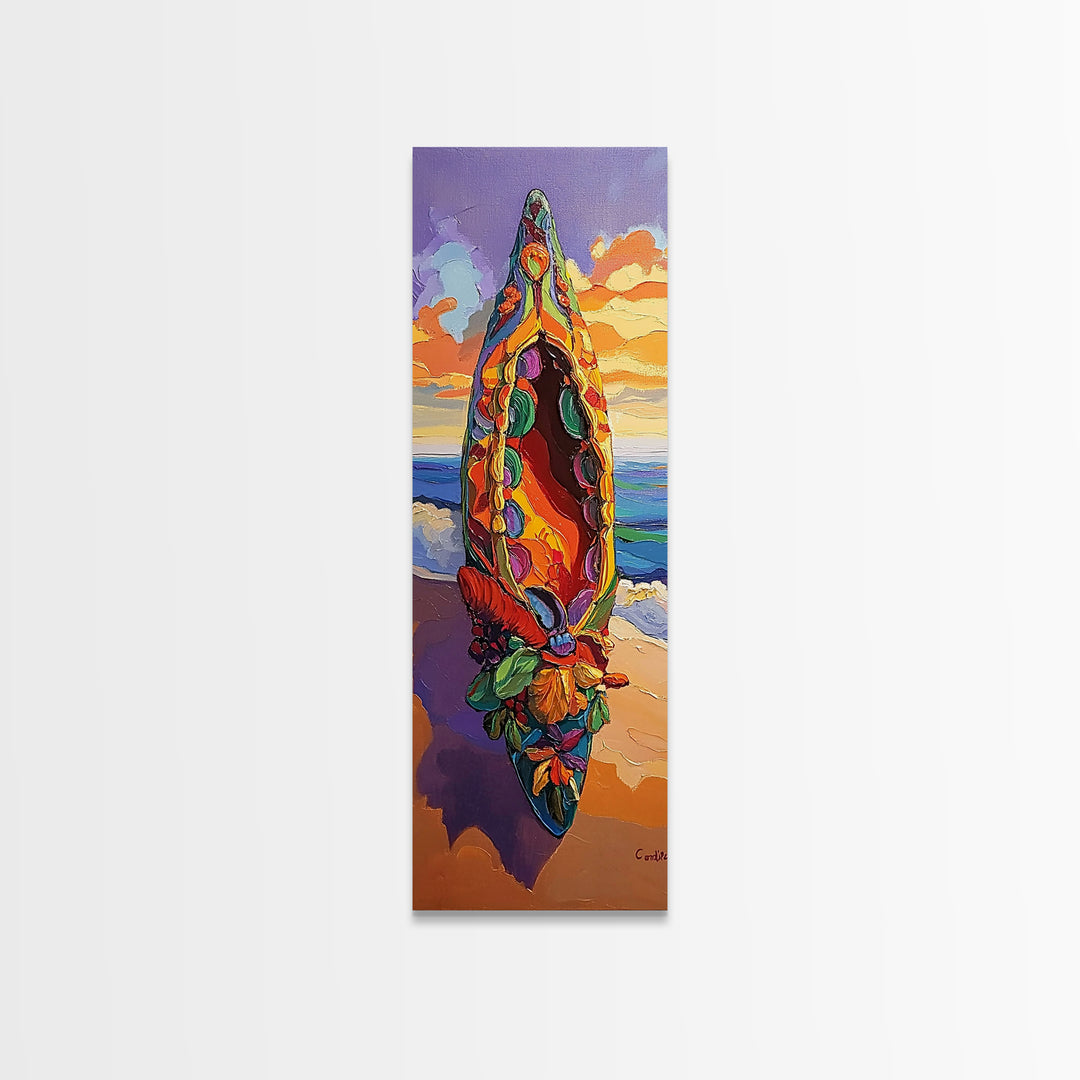 Canoe Beach, Sunset, Vibrant Boat Art Framed Canvas Print, Coastal Wall Decor, Tropical Living Room Art, Colorful Boho Adventure Scene