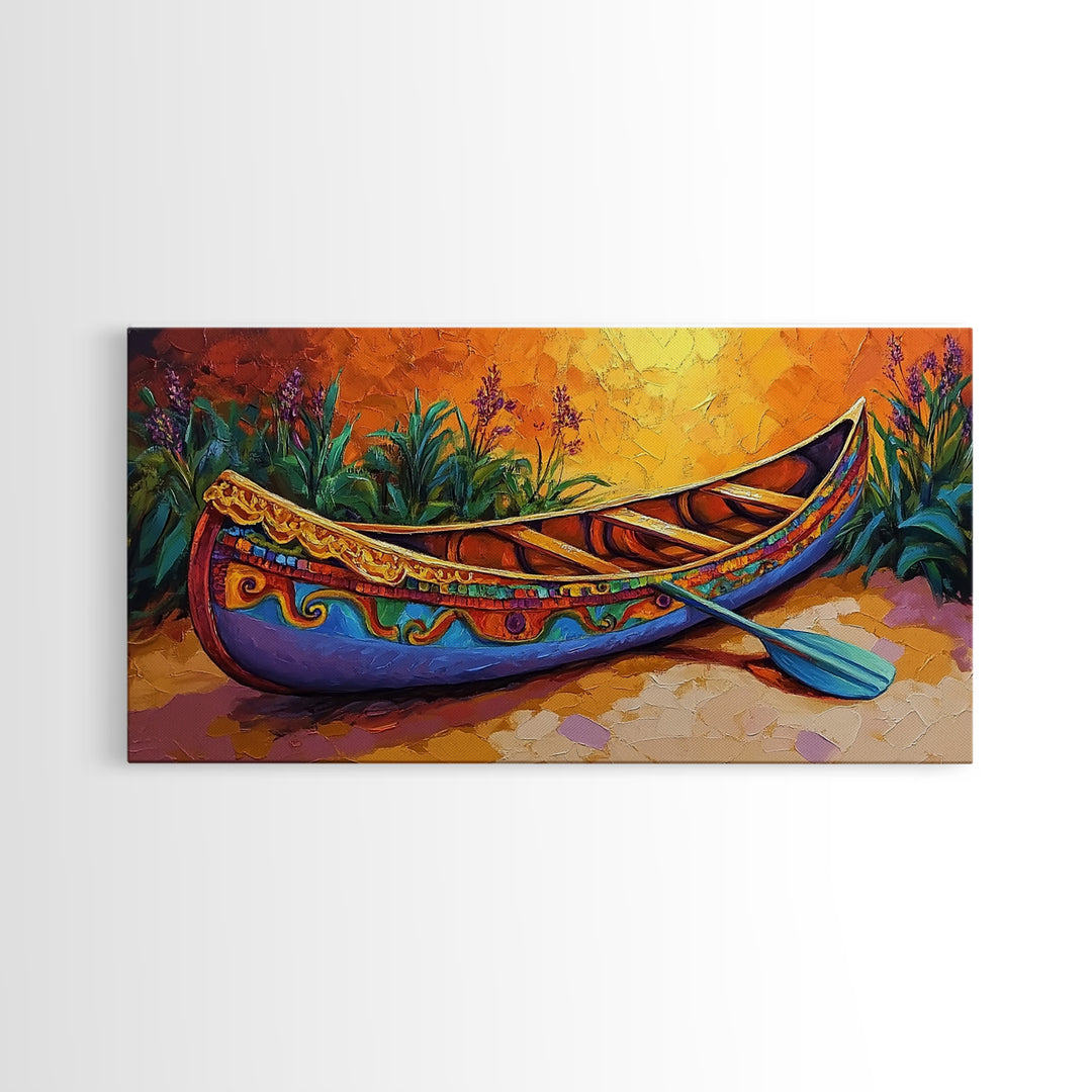 Canoe Golden Light, Rustic Vibes, Outdoor Art, warm boho Canvas Print, colorful desert decor, fall southwestern living wall art