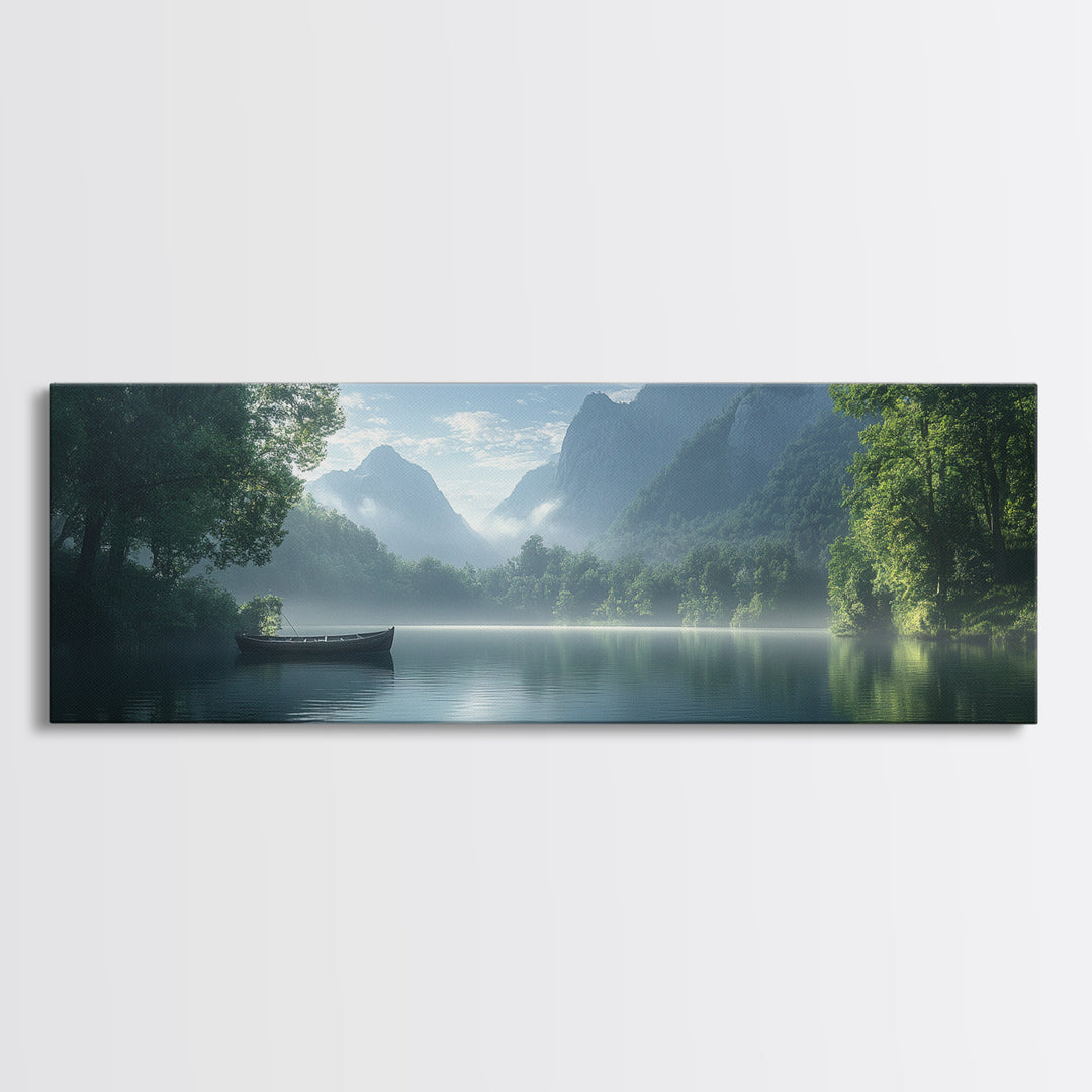 Canoe painting, lake decor, mountain painting, rustic wall art, serene landscape, farmhouse art, extra wide art, framed canvas print, nautical