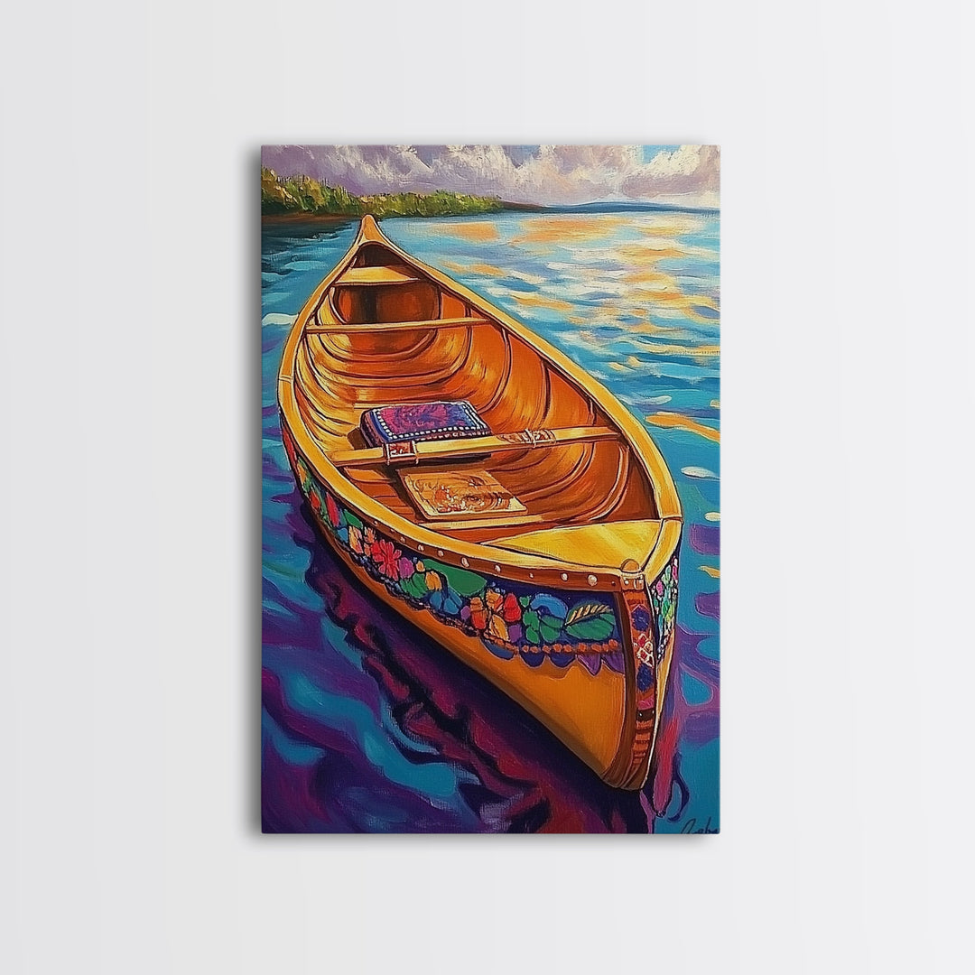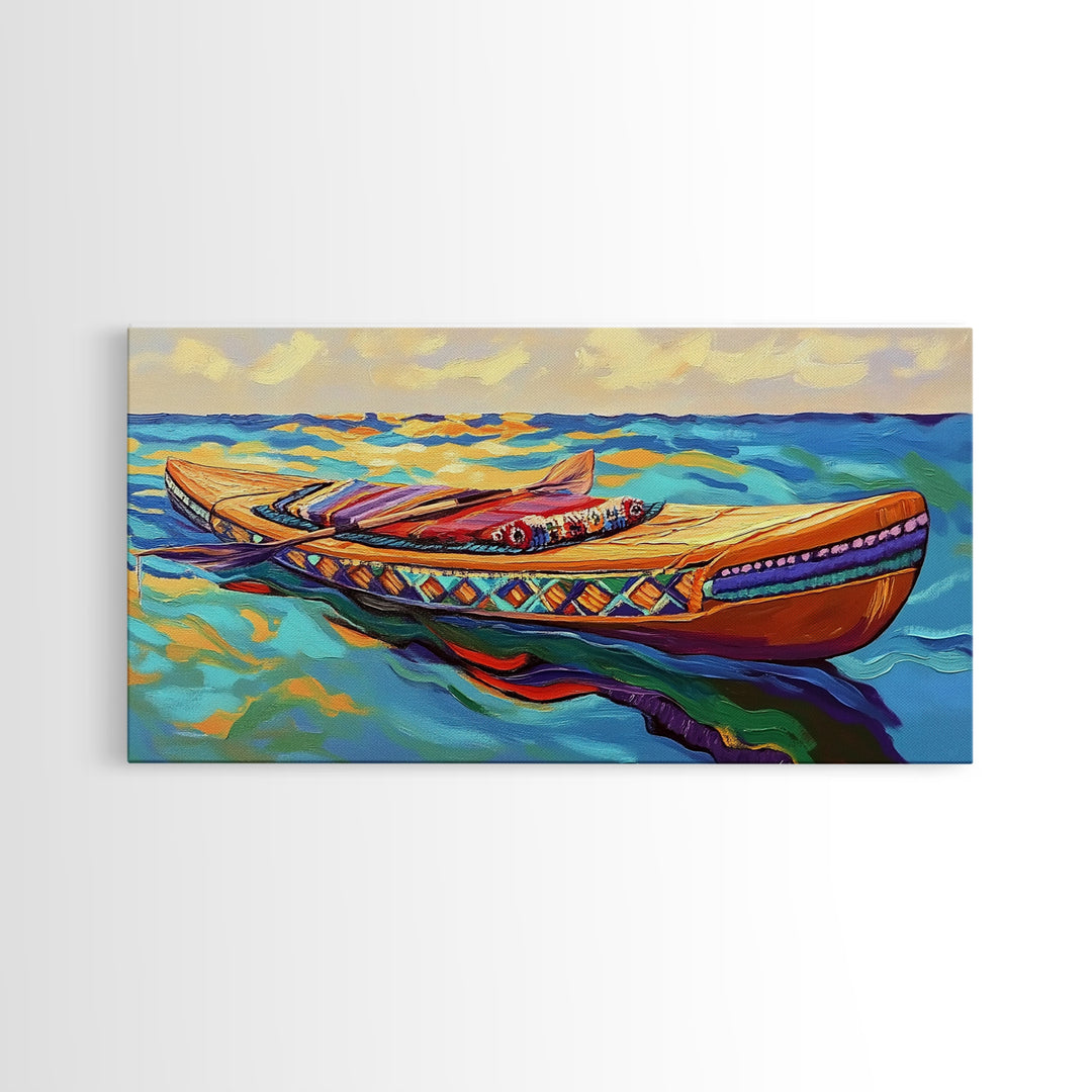 Canoe Water, Colorful, Tribal, Canvas Print, boho kayak art, nautical decor, beach house wall art, rustic folk painting, summer vibe