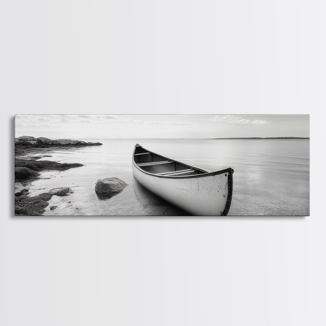 Canoe Lake, Tranquil Nature Art, Black and White Landscape, Framed Canvas Print, Serene Home Decor, Cabin Wall Art, Adventure Painting