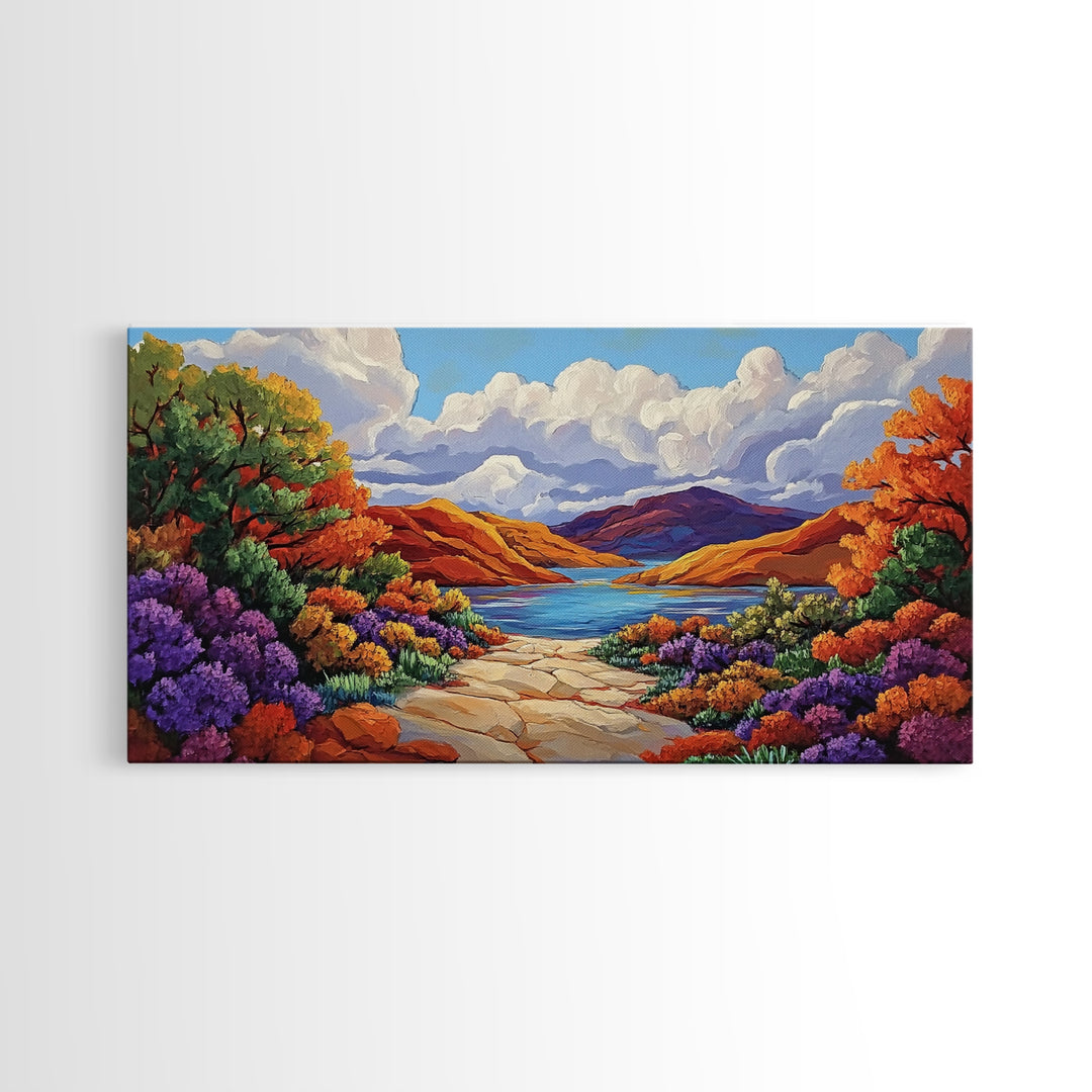 Canyon Lake Path, Colorful Wildflowers, Bold Autumn Hills, Framed Canvas Print, Nature Inspired Wall Art, Southwestern Decor
