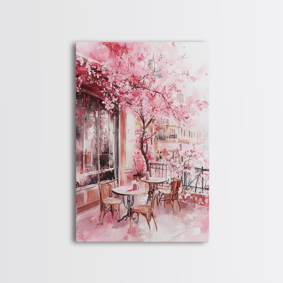 Cherry Blossom Café Framed Canvas Print Romantic City Scene, Cottagecore Pink Wall Art, Feminine Decor Bedroom Living Room Art